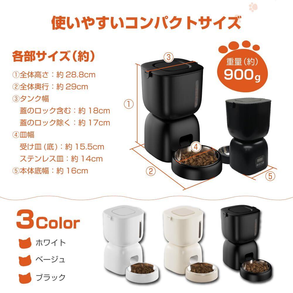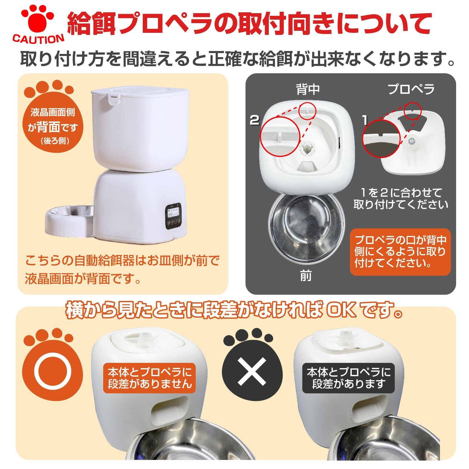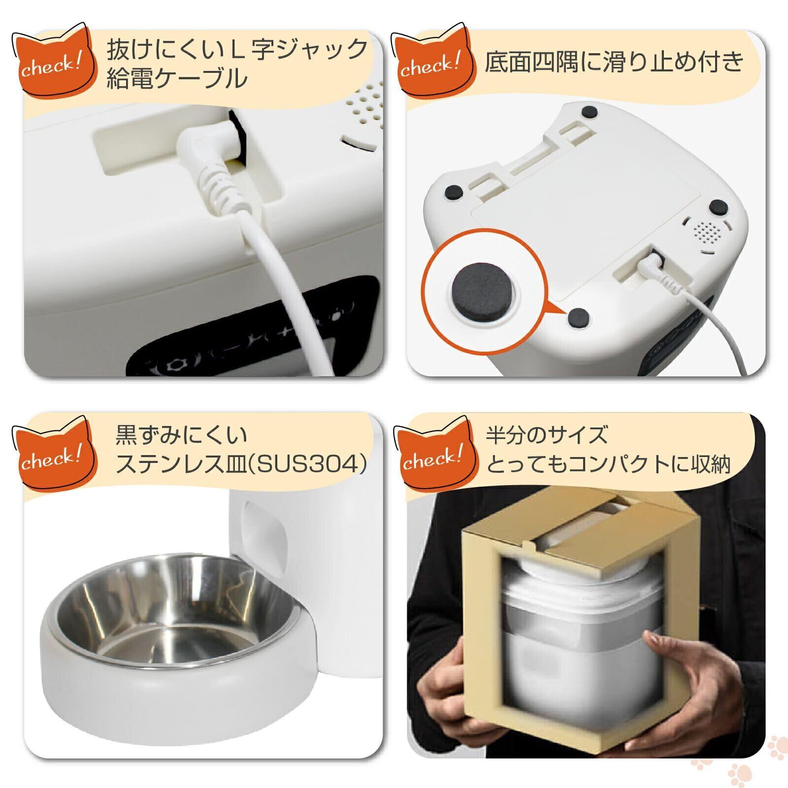 【製品の特長】 ・飼い主さんの声を録音できる! 最長10秒間の音声録音が可能。給餌毎に再生するので怖がりなペットも慣れやすい! ・簡単設定&シンプル操作! 1日最大4食までご飯の回数と時間を決められます。 設定しておけば、タンク内のフードが無くなるまで毎日同じ時間にご飯があげられ、忙しいときや急な外出の際もペットを腹ペコにさせずに済みます。 当社オリジナルの日本語取扱説明書付きで設定も安心! ・ペットにあわせてフード量を調整 1回の給餌量は、10gの少量から最大90gまで10g単位で設定可能です。 毎回フードを計測する手間が省けて、大切なペットの健康管理もよりしやすくなります。