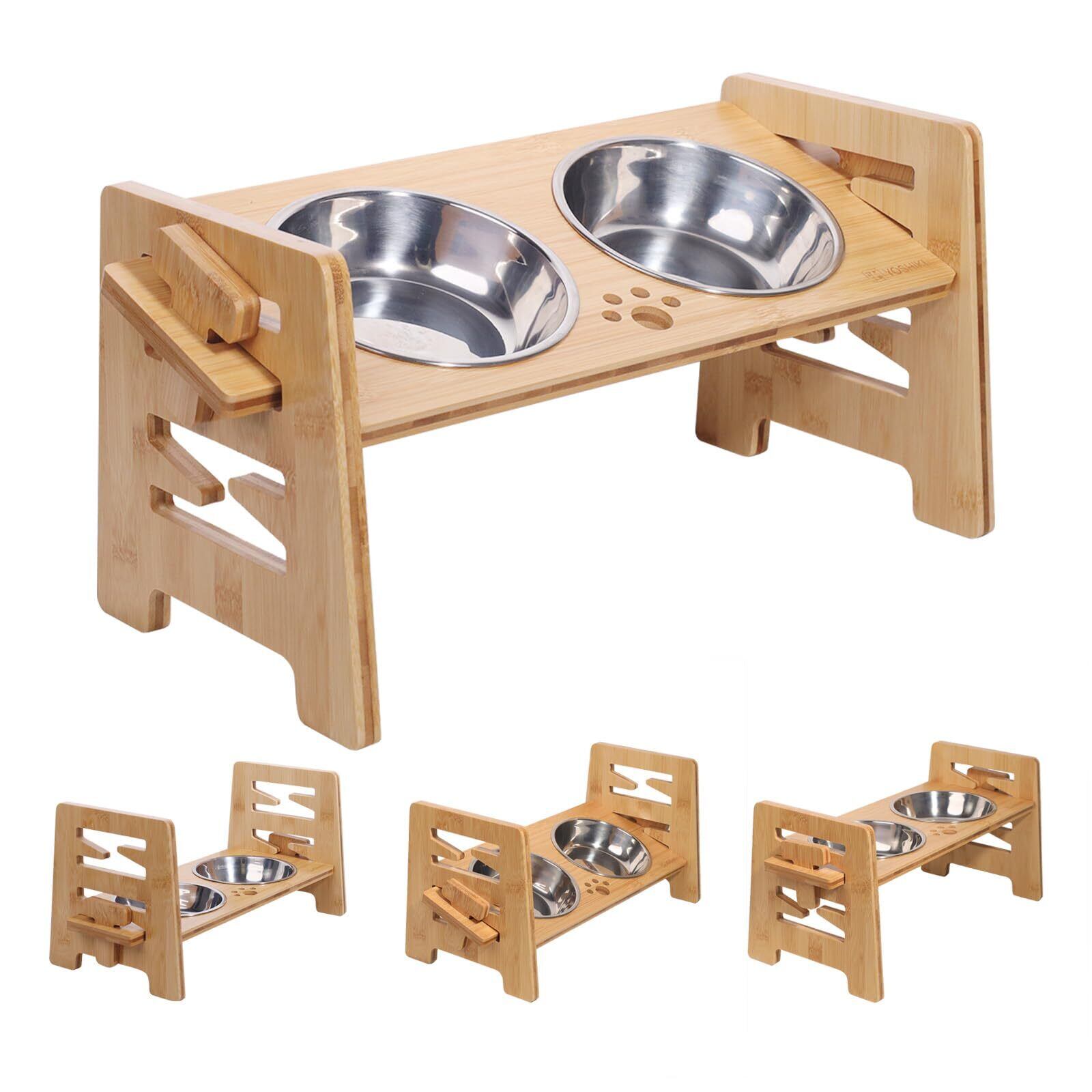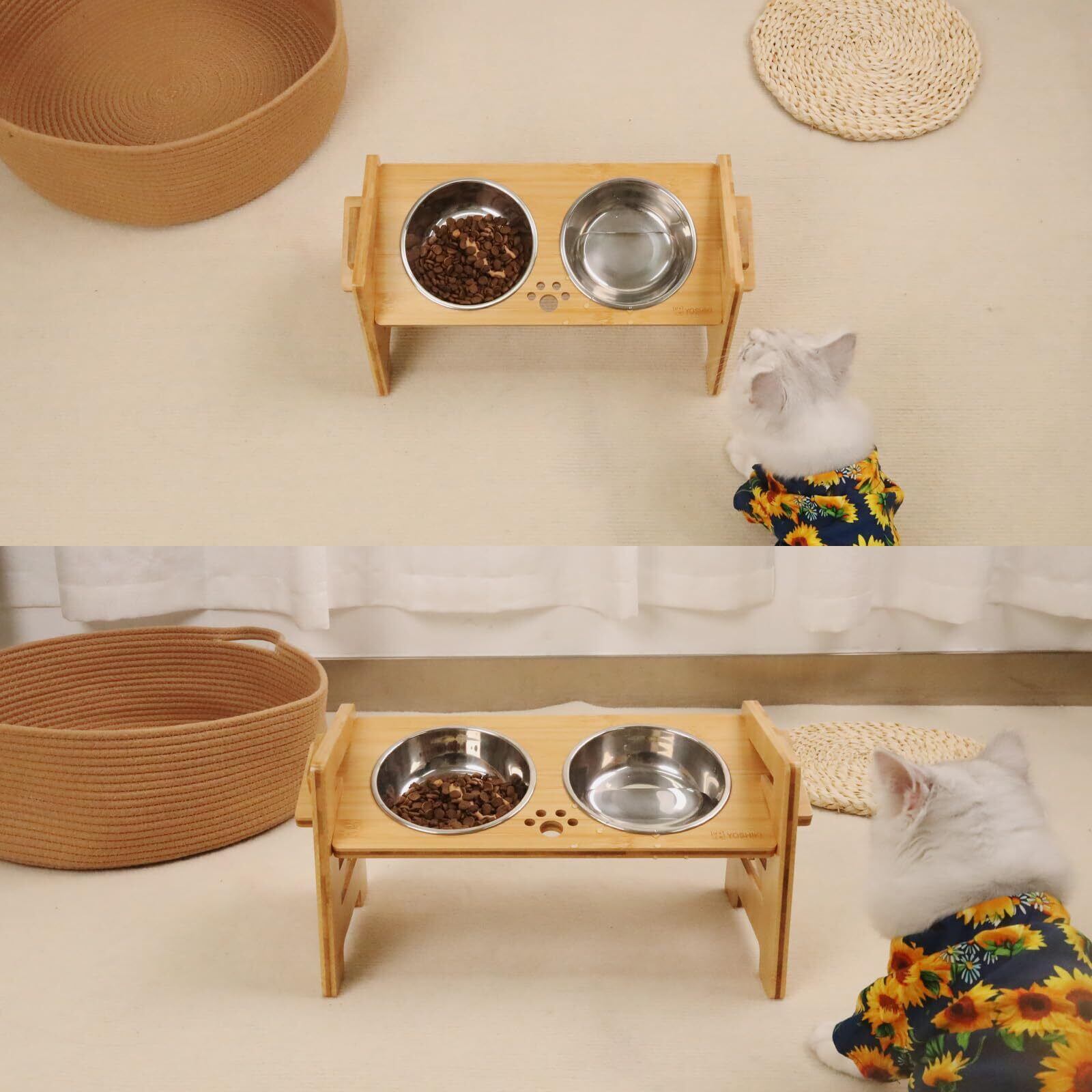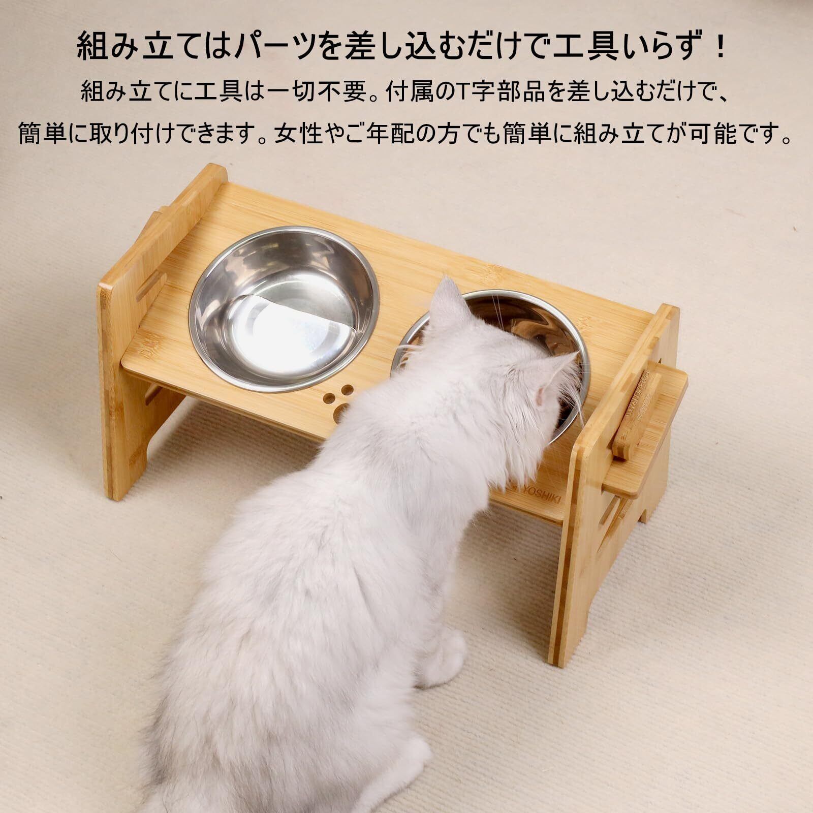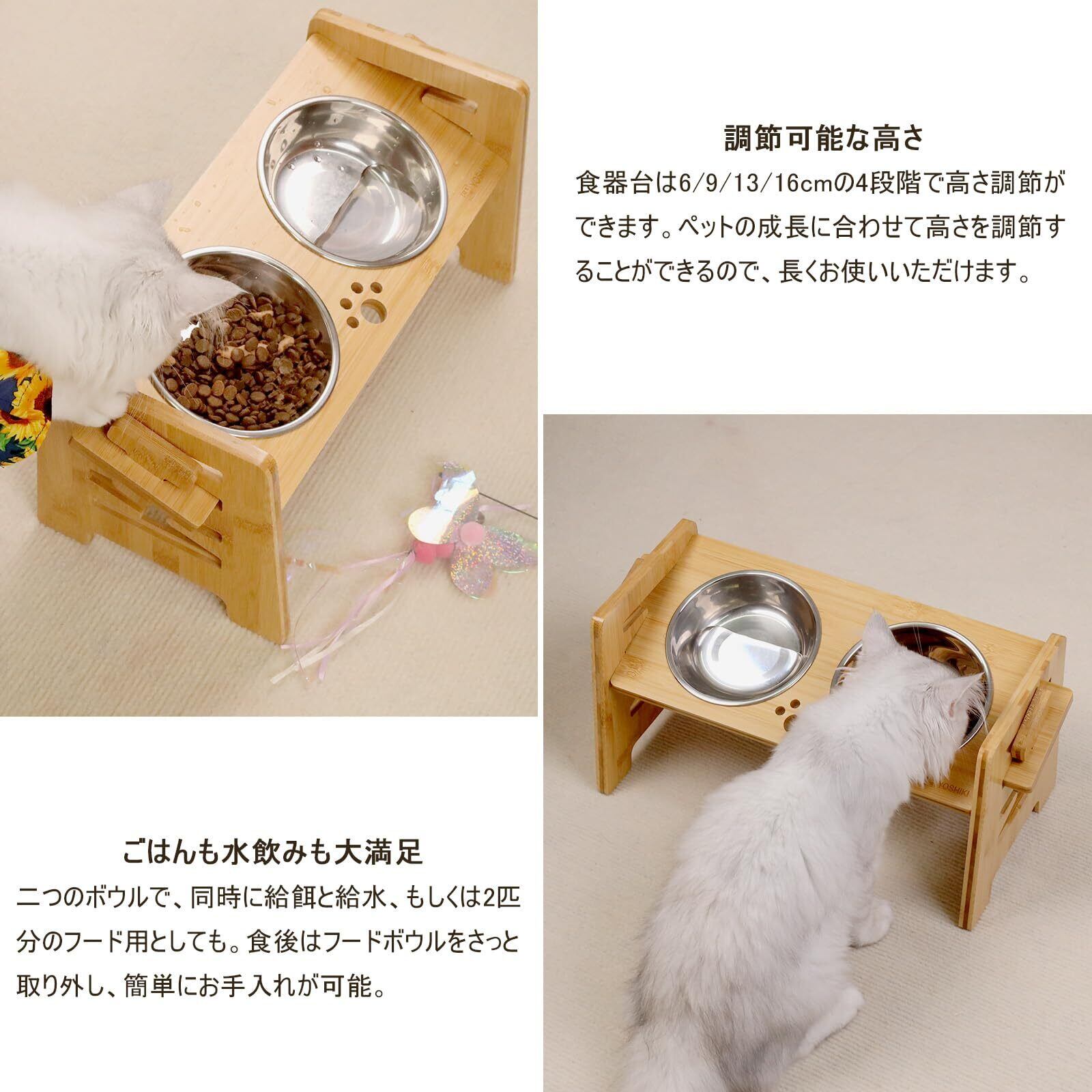 ❺特徴:犬や猫の成長に合わせて、6/9/13/16cmの4段階で調整可能なペット食器台です。食べやすい適度な角度に設計されており、ペットの体への負担を和らげ、らくな姿勢で食事ができます。二つのボウルがセットで同時に給餌・給水ができ、お手入れも簡単です。