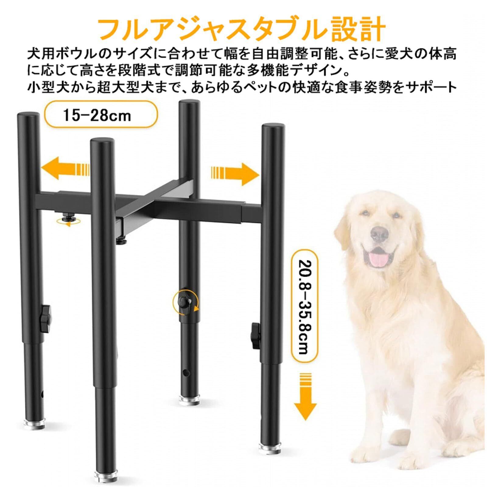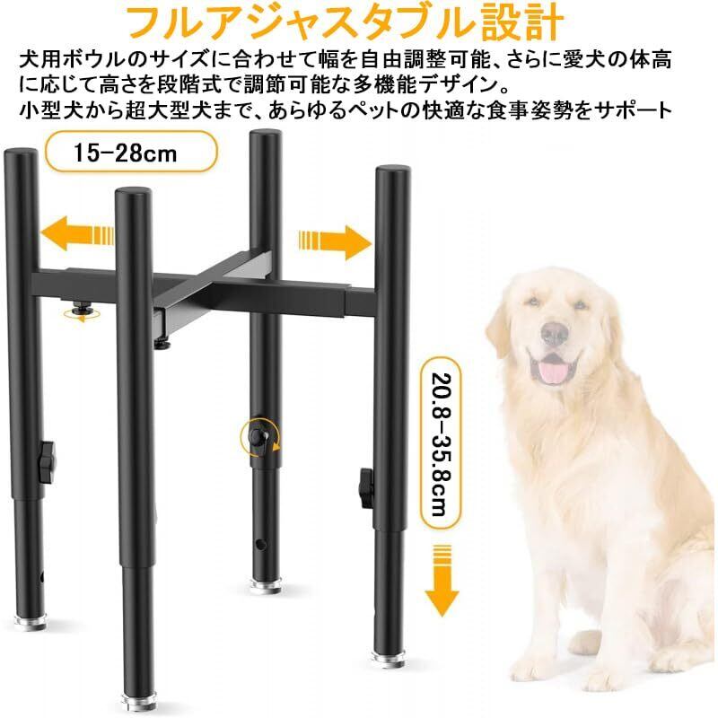 【高さ自由調整で最適な姿勢をサポート】 高さ15cmから31cmまでスムーズに調節可能。子犬から成犬まで、またダックスフントなど胴長犬種の関節負担を軽減します。幅16~26cmの調整範囲で、様々な体型の愛犬にぴったりの食事姿勢を実現。