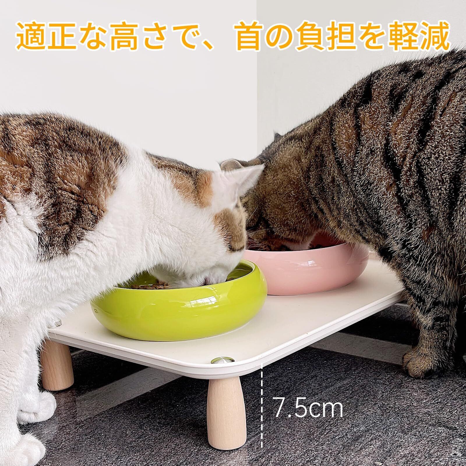 【愛寵の楽な食事姿勢を固定サポート】 本品は固定高さ7.5cmに設計されており、地面で食べるよりも首と腰への負担を軽減します。無理な姿勢をなくし、消化を助ける理想的な食事の高さを提供します。
