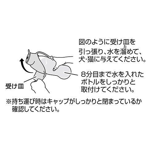 18分目まで水を入れたボトルをしっかりと取付けてください。2受け皿を引っ張り、水を溜めて、犬・猫に与えてください。※持ち運び時はキャップがしっかりと閉まっているか確認してください。※口径や形状が合わないペットボトルもありますのでご注意ください。※ボトルを凍らせたり、中にお湯を入れて使用しないでください。※やわらかい、または薄いペットボトルは使用しないでください。