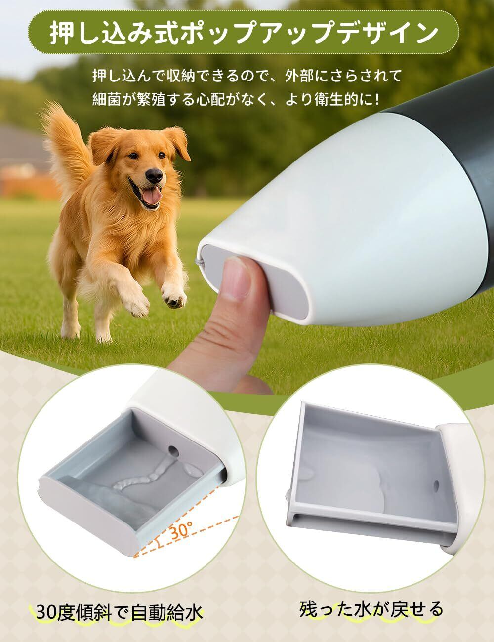 【水漏れ&収納式お皿】押し込み式ポップアップ式、閉じるときはしっかりと給水口を塞ぎ、密封性が高く、漏水を効果的に防止するのでカバンの中などに入れて持ち歩くのにも安心!また、お皿は収納して外部との接触による細菌やホコリの侵入を防ぎ、より清潔で衛生的です。