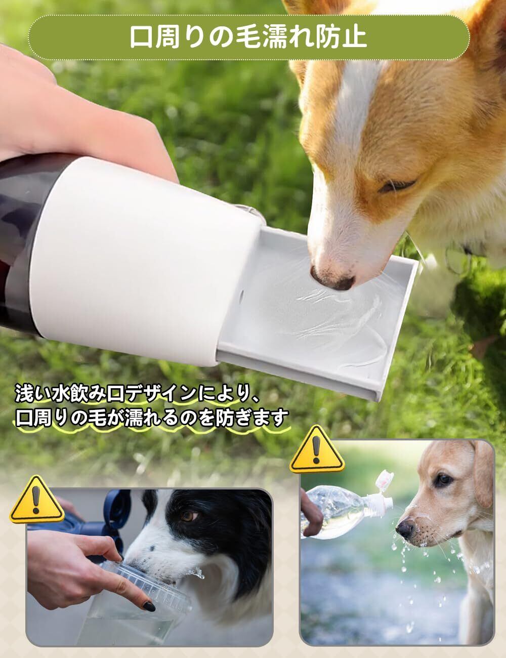 【口周りの毛濡れ防止】ペットウォーターボトルのお皿部分は犬が飲みやすい浅口形状に設計されており、無理なく自然な姿勢でしっかりお水を飲めながら、口周りを濡らしません、皮膚炎予防にも役に立ちます。猫ちゃんにも最適!
