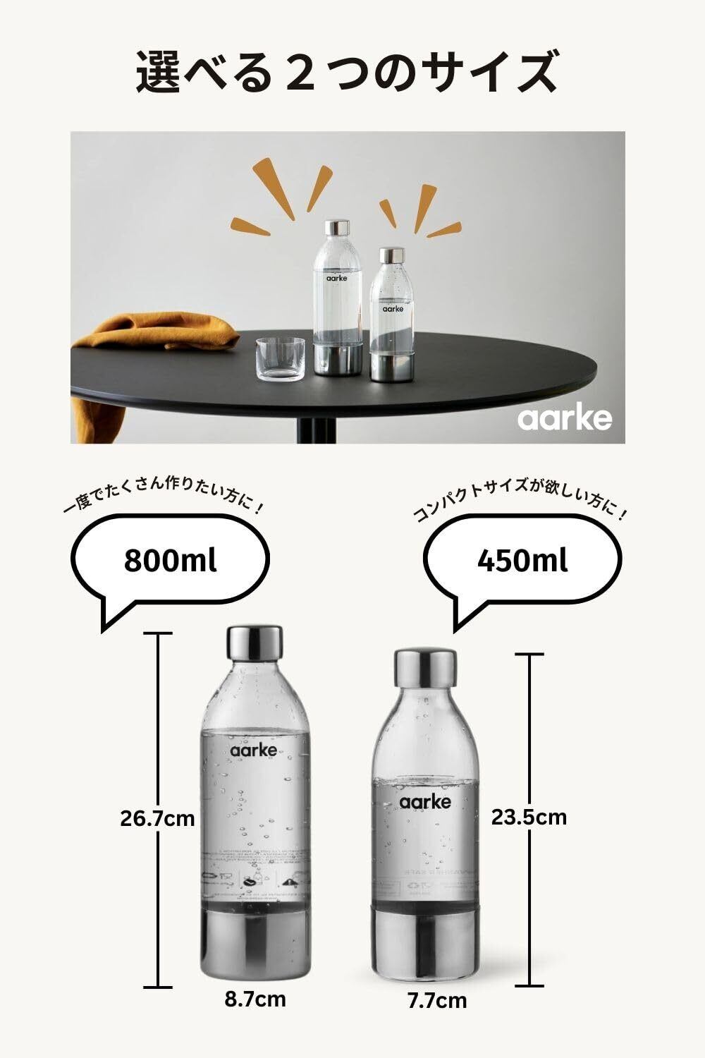 【商品仕様】最大容量450ml、メモリの線まで水を入れてお使いください。冷水以外はご利用になれません。※推奨:冷水(4-6℃)最大40 ℃未満。必ず専用ペットボトルに記されている給水線(目盛線)まで水を入れてご利用ください。 目盛線を守らない場合、水が本体の中に入ってしまうことがあり、時間が経つにつれて破損する可能性があります。ジュースやワイン、牛乳などは絶対に炭酸化しないでください。 その他、専用ボトルには果物、野菜、ハーブ、フレーバー系の化合物やシロップを入れないでください。また、気の抜けた古いソーダ水の再炭酸化はしないでください。※専用ペットボトルを冷凍庫には入れないでください。※バクテリアの繁殖や悪臭がしないよう、専用ペットボトルは常に清潔な状態で保管してください。※他社の炭酸水メーカーに、AARKEのボトルを絶対に使用しないでください。※AARKE以外の他社メーカーのボトルはご利用になれません。強引に装着する行為は故障や事故の原因になります。