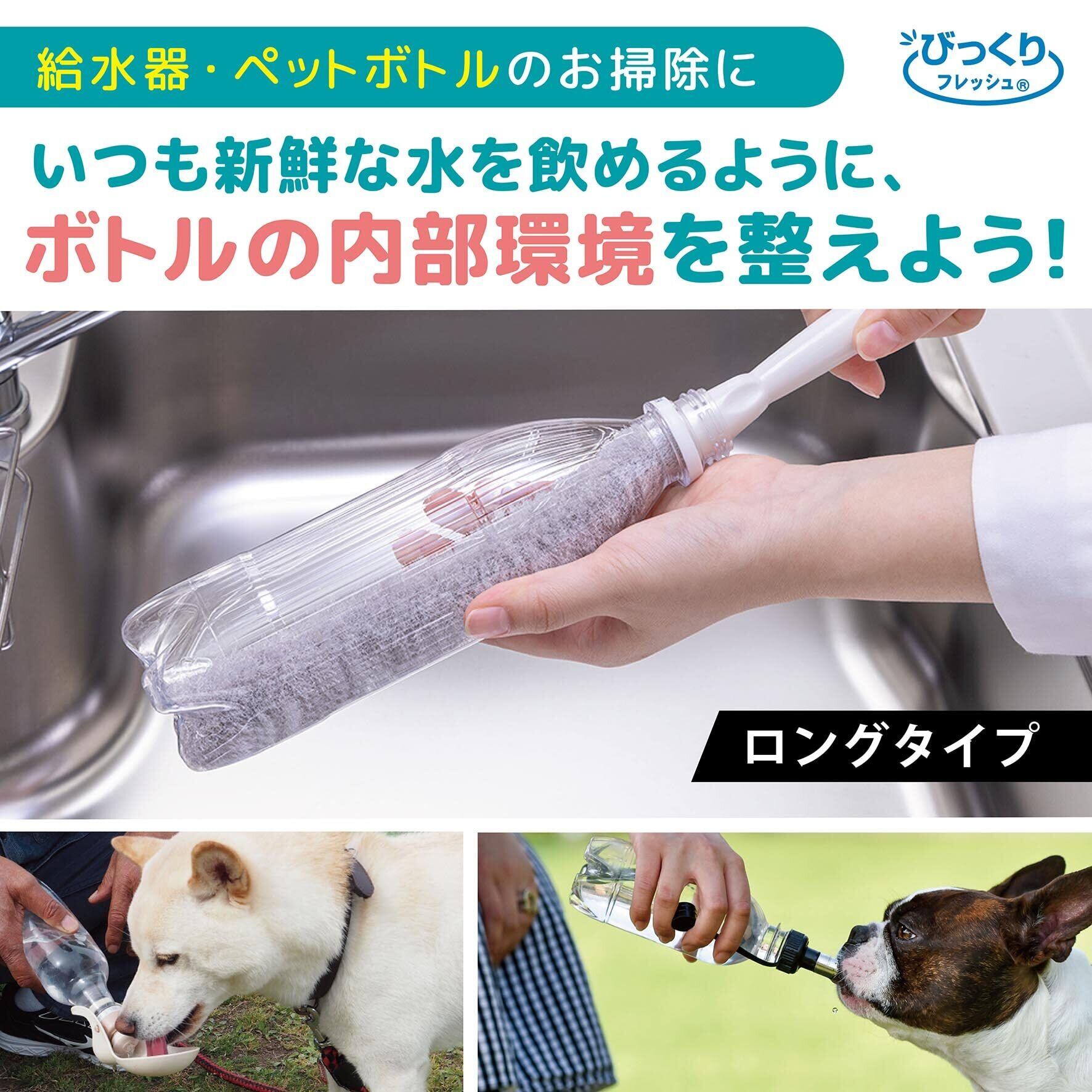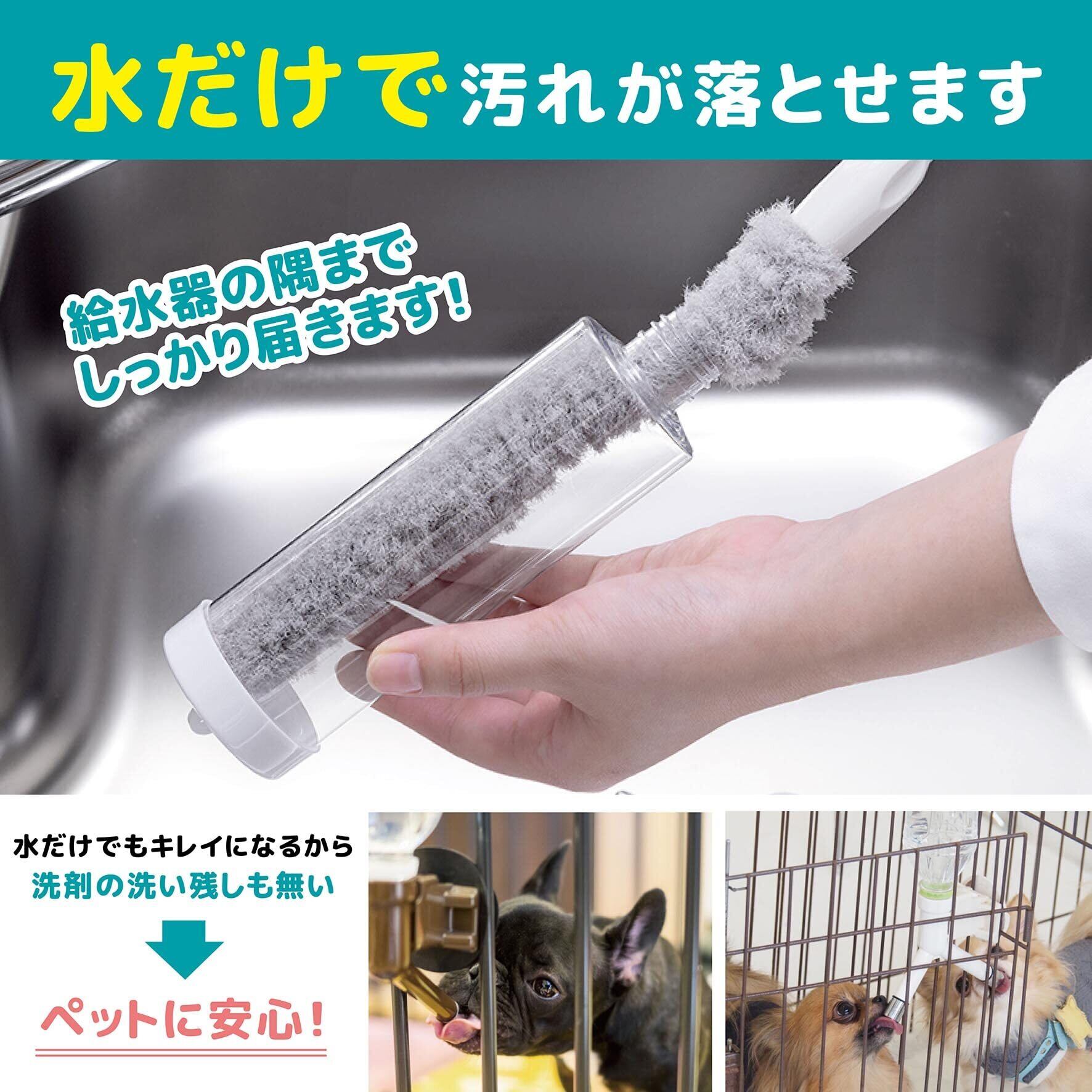 ・繊維で洗うので、ステンレスやプラスチックを傷つけません。 ・本体は洗う所に合わせて手で曲げて使えます。 ・水だけでも汚れを落とす繊維で、底のスミまできれいに洗えます。 ・細かい箇所も洗えるブラシ付きです。 ・口径18㎜まで対応。 ・ロングはウサギ、モルモットに使われる水飲みボトルが対象。水を飲む量が多く、ペットボトル500mlを一日で飲むほど。なのでボトルサイズもペットボトルに近いサイズが多いため。