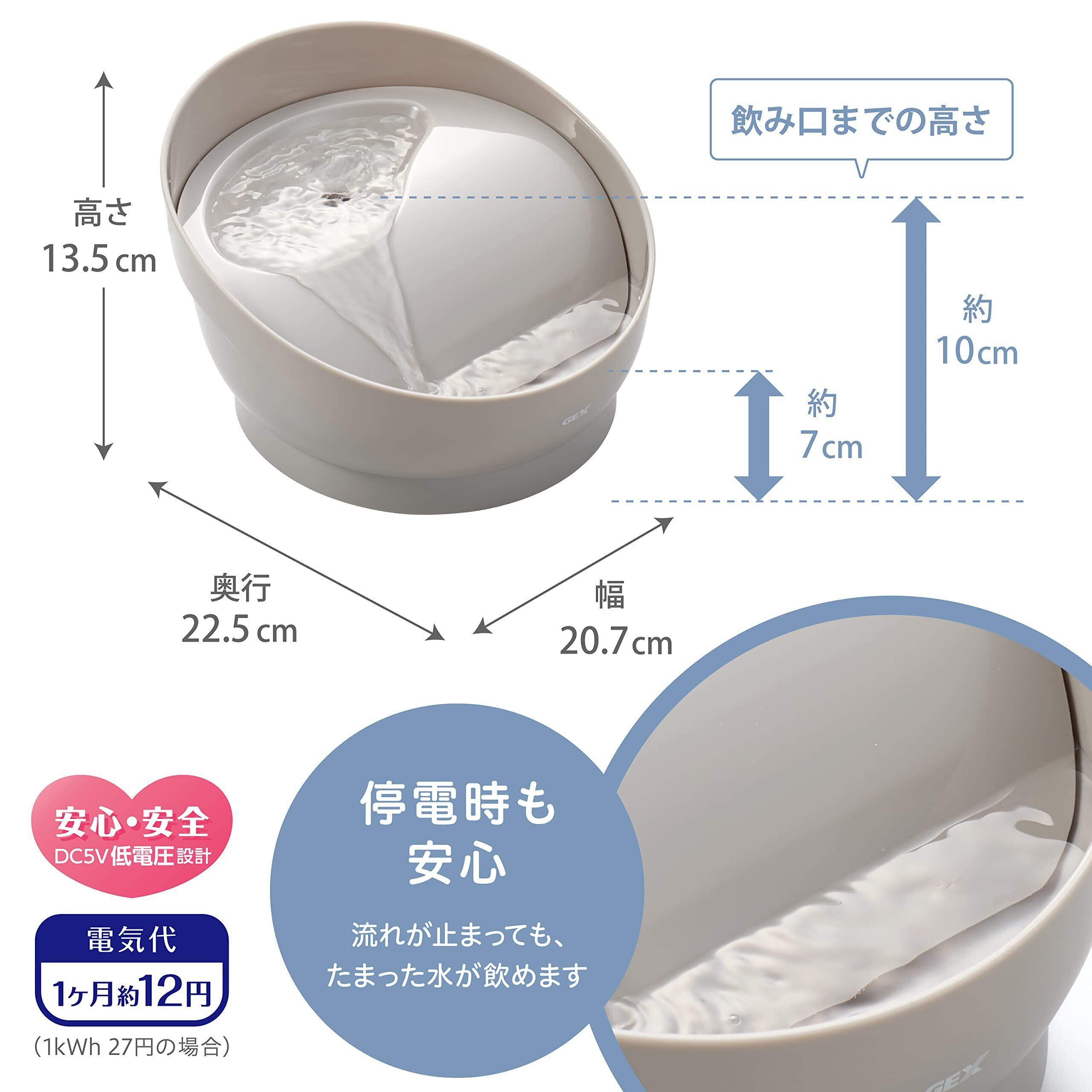 はじめてでも飲みやすいお皿タイプ。夜のおやすみも邪魔をしない超静音*DCポンプ採用。流れる、たまる2つの飲み方で停電時も安心。*ポンプ音約20%低減 (当社従来比)。アダプターは別売です。 軟水化フィルター1枚付き!下部尿路の健康維持に。ポンプで水を循環させてフィルターできれいな水に。いつもたくさんキレイな水を! ごくごく飲む!飲水量30%UP!※第3者機関による試験より。 お掃除簡単なシンプル構造。