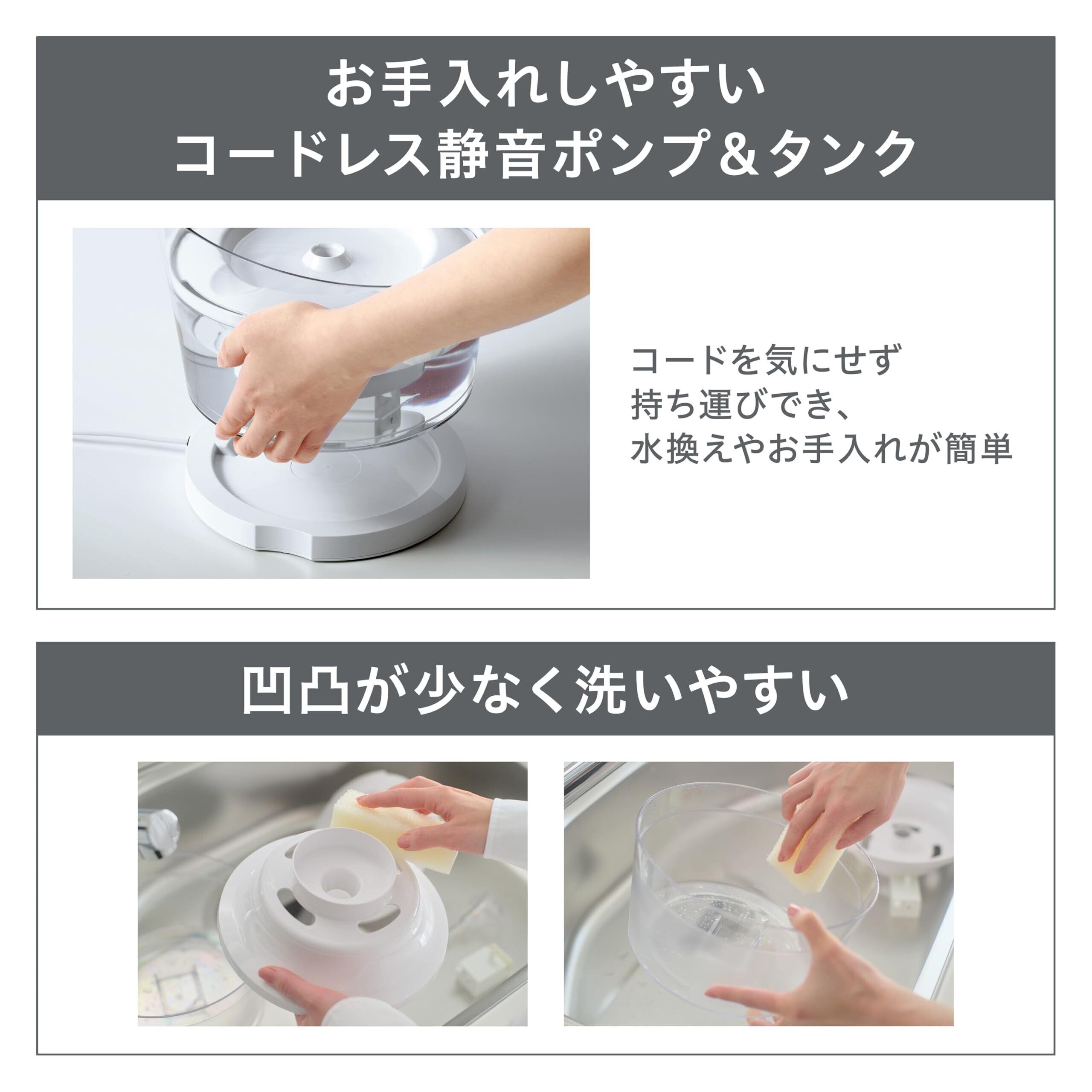 ●いつでも清潔でおいしい水を ●お手入れしやすいコードレスポンプ&タンク ●ごくごく飲む!飲水量20%UP! 獣医師推奨(※第三者機関による試験より/顧問獣医師の推奨となります。) ●静音設計 ●水位低下お知らせランプ&自動停止する安全設計