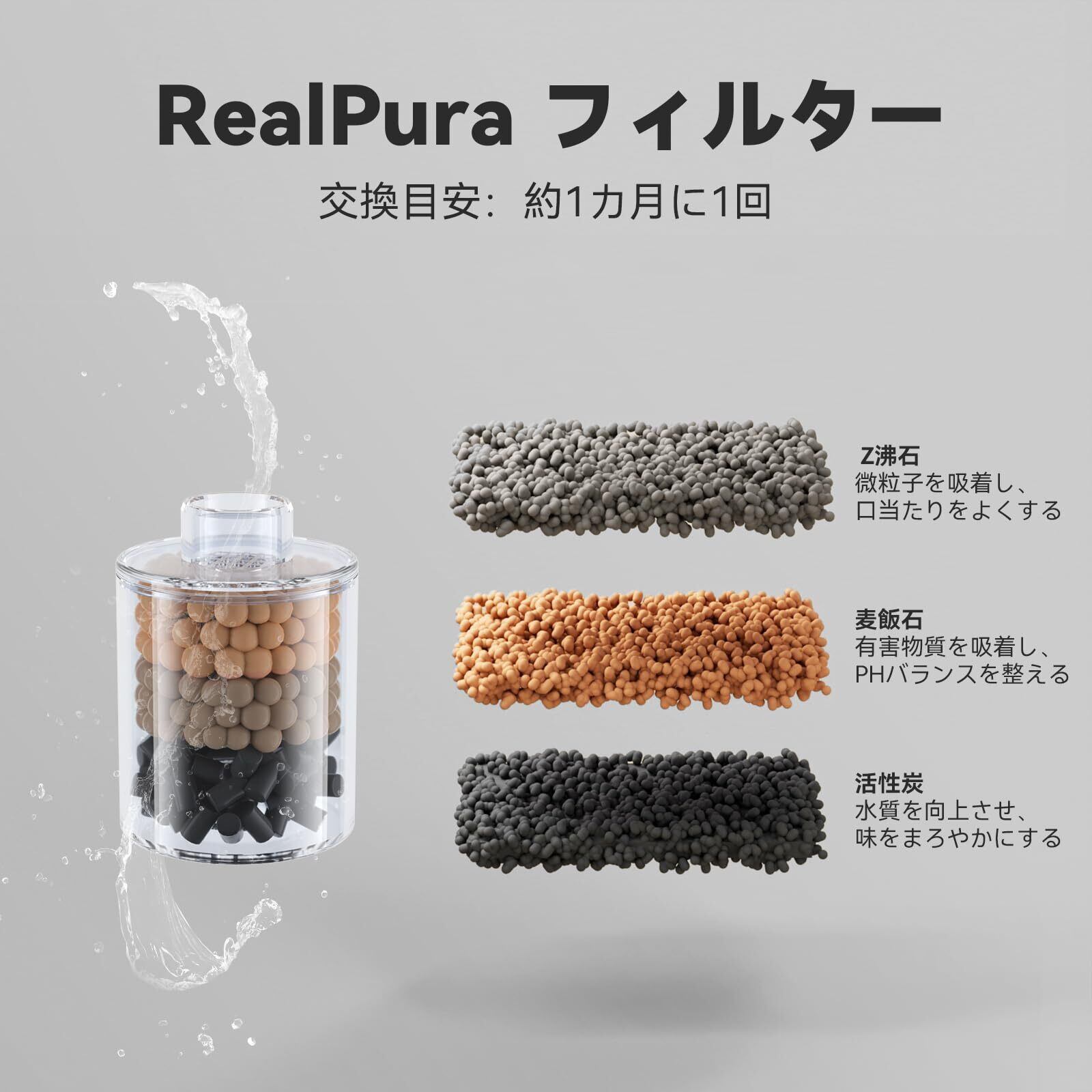 フィルターの構成:高ヨウ素値活性炭(有害物質やにおいを除去)、多孔質ゼオライト(イオン交換による重金属を除去)、多孔質マイタケ石(水質を向上させ、Phバランスを整える)。