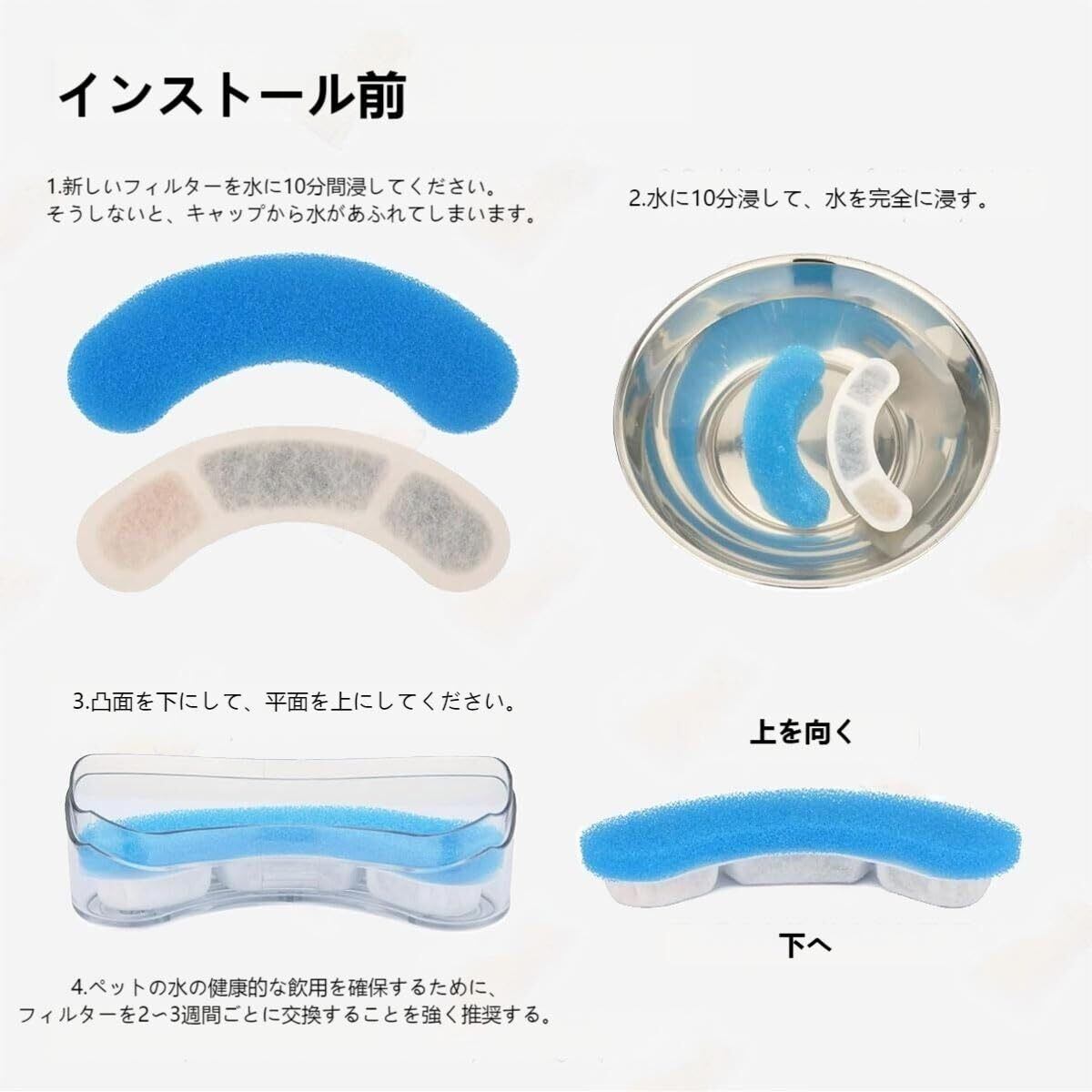 【暖かいヒント】猫水フィルター交換品を2-5分間水に浸し、使用前に水道水で完全に洗い流してください。20-30日ごとに猫用ウォーターサーバーフィルターを交換して、ペット用ウォーターサーバーを維持し、水を新鮮に清潔に保つことをお勧めします。取り付けのヒント: 平らな面を上に、凸面を下にしてください。