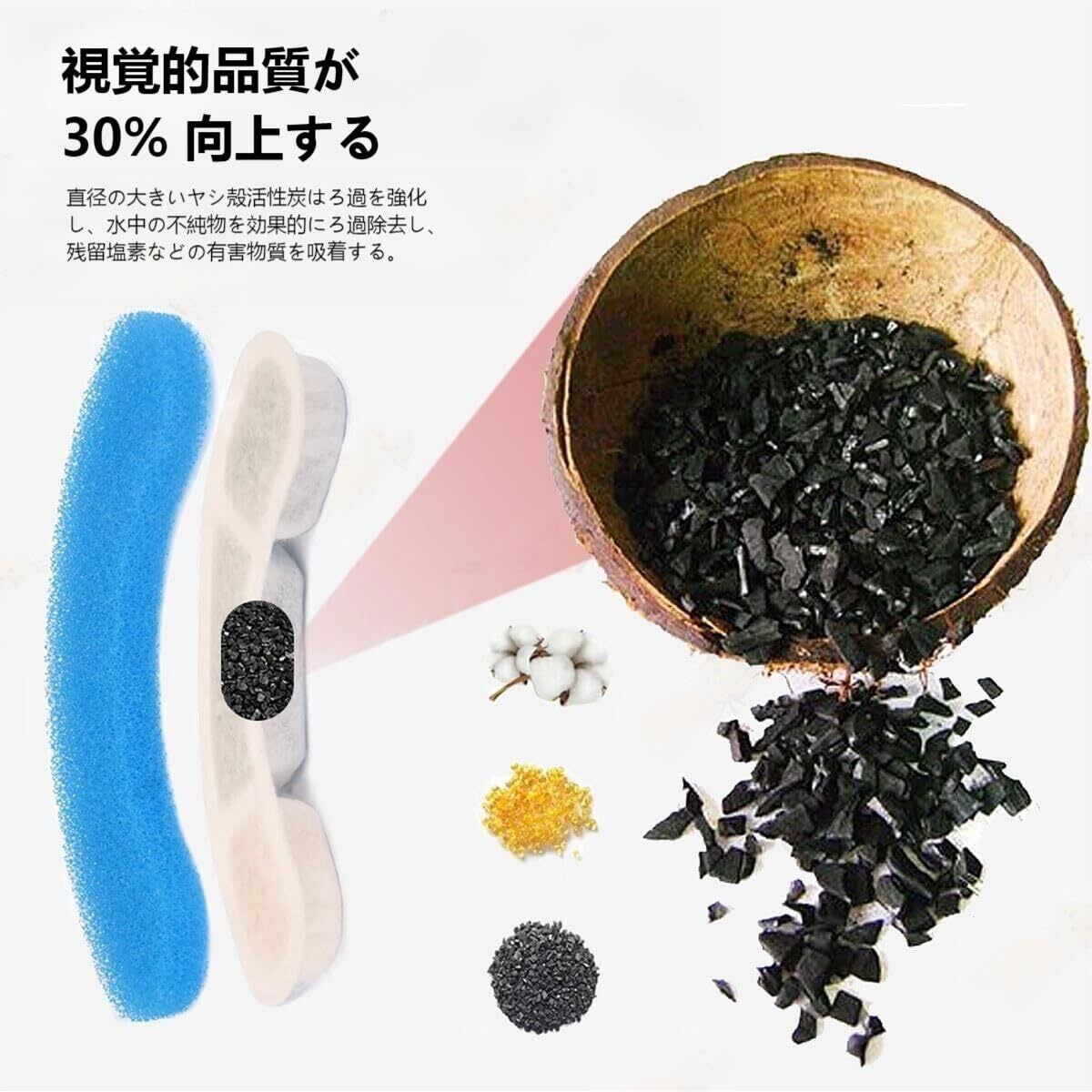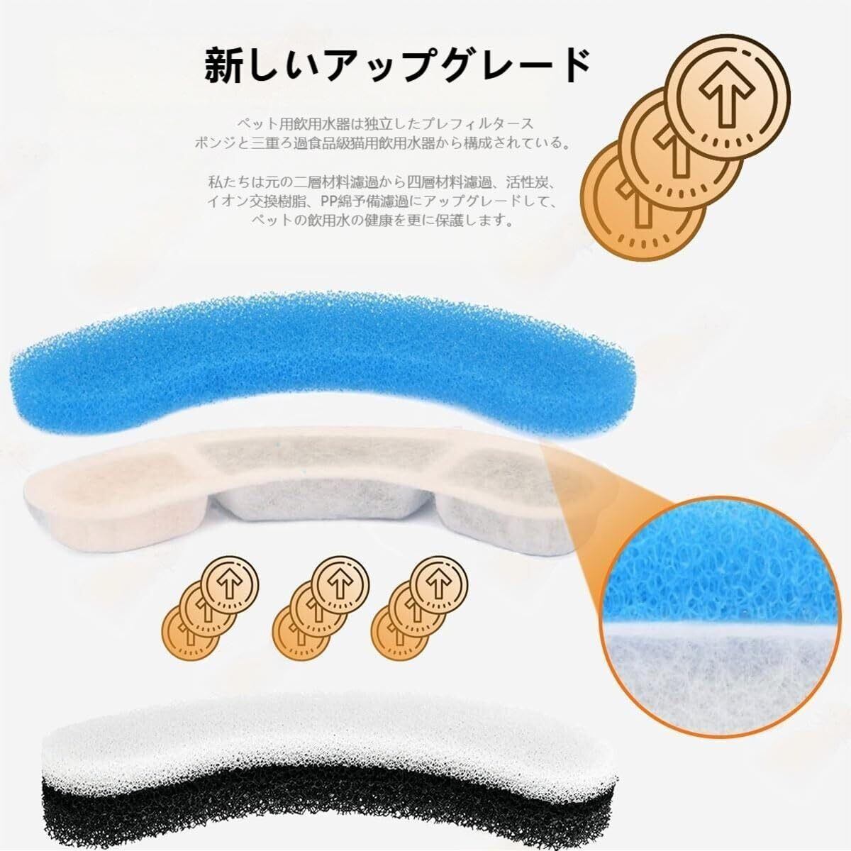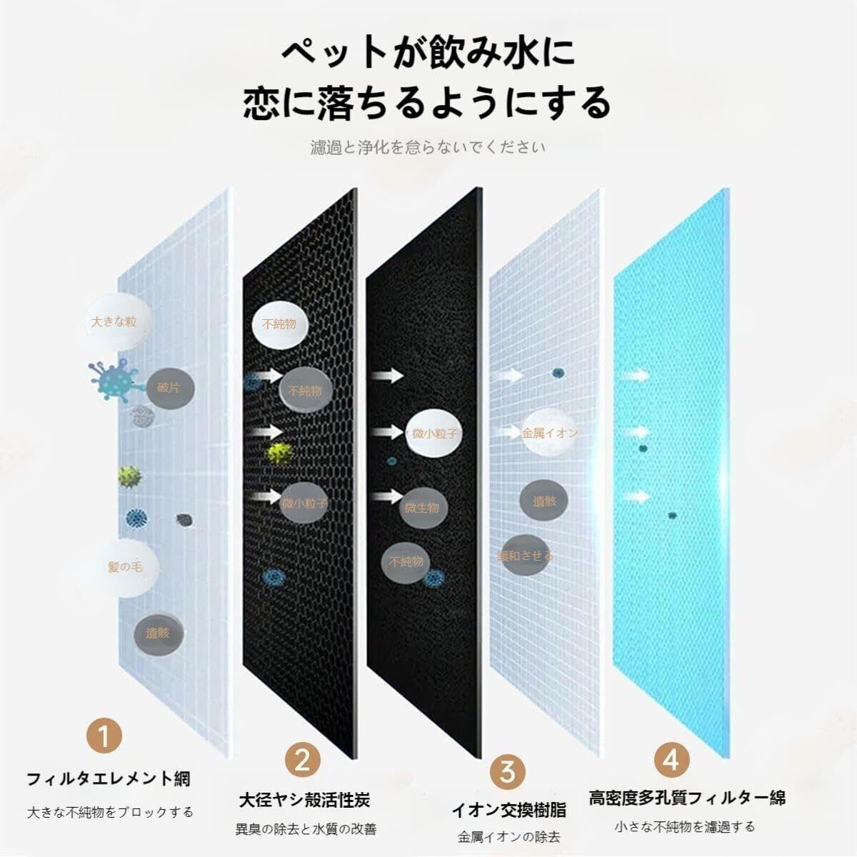 【四重濾過】猫 自動給水器は活性炭フィルターを採用し、別体のプレフィルタースポンジ、不織布、活性炭とイオン交換樹脂からなり、四重ろ過システムの構造になっている。臭気の除去や水質の軟質化に効果的である。またフィルタースポンジはペットの毛、垢、食べ物くずを捕捉し、ペットに浄化されたヘルシーな水を提供する。尿路感染のリスクを低減します。