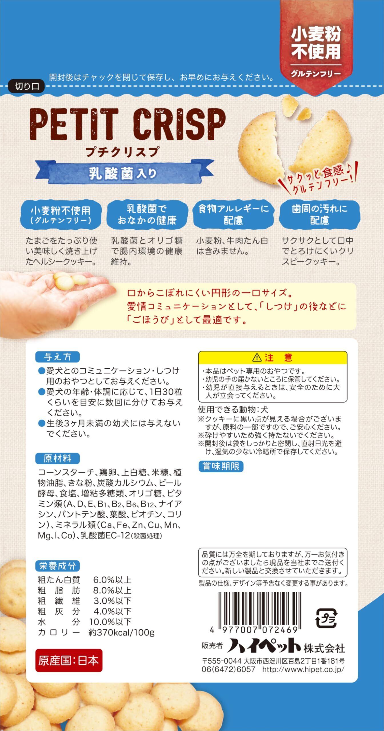 ・歯周を汚しにくいクリスピータイプでサクサクおいしいヘルシークッキーです。 ・グルテンフリー(小麦粉不使用)。たまごをたっぷり使いおいしく焼き上げました。 ・乳酸菌とオリゴ糖で腸内環境の健康維持 ・小麦粉、牛肉たん白は含みません。(アレルギーに配慮) ・口からこぼれにくい円形の一口サイズ ・愛情のコミュニケーションとして「しつけ」の後などに「ごほうび」として最適です。