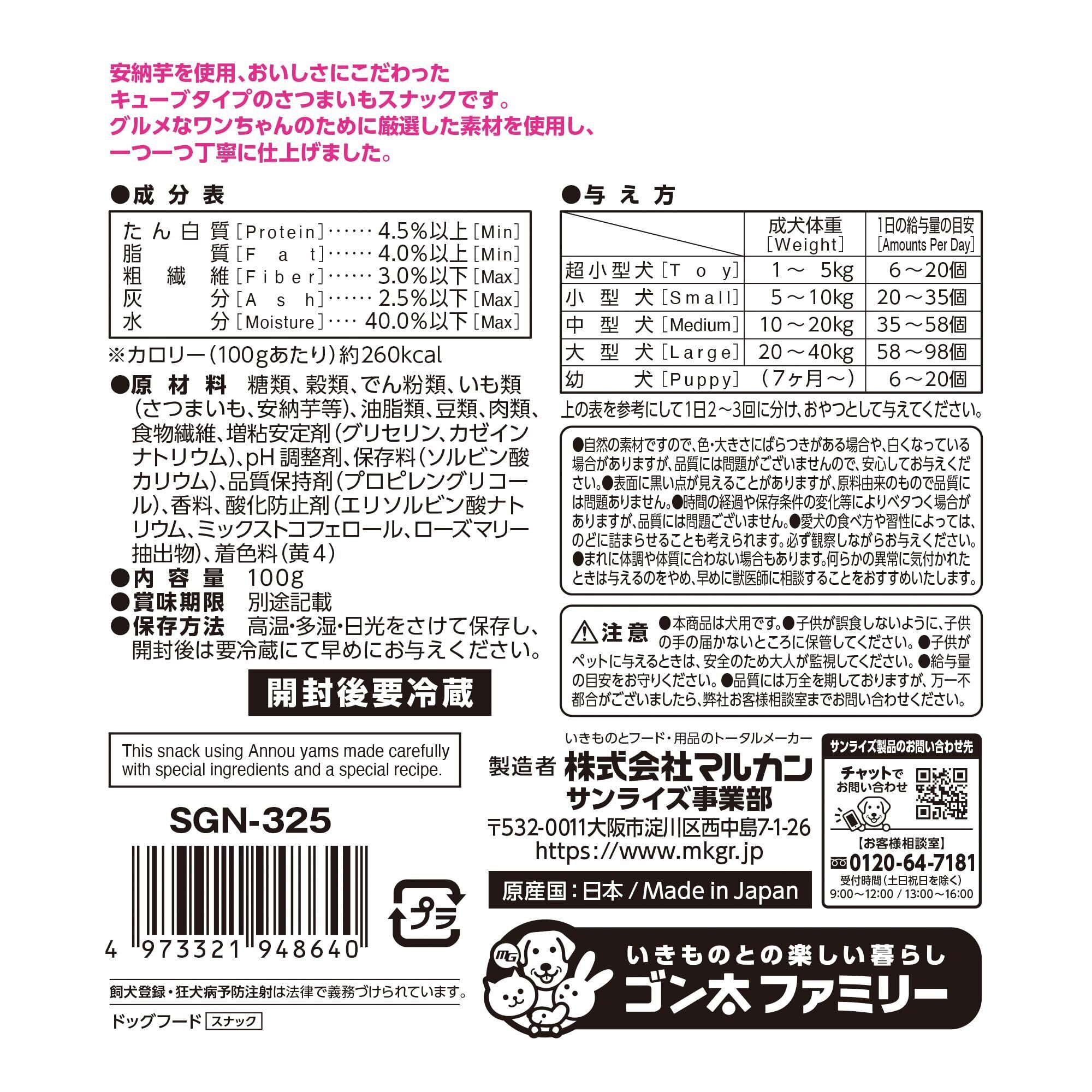 【原材料】糖類、穀類、でん粉類、いも類(さつまいも、安納芋等)、油脂類、豆類、肉類、食物繊維、増粘安定剤(グリセリン、カゼインナトリウム)、pH調整剤、保存料(ソルビン酸カリウム)、品質保持剤(プロピレングリコール)、香料、酸化防止剤(エリソルビン酸ナトリウム、ミックストコフェロール、ローズマリー抽出物)、着色料(黄4)【成分】たん白質:4.5%以上、脂質:4.0%以上、粗繊維:3.0%以下、灰分:2.5%以下、水分:40.0%以下【エネルギー】260kcal/100g