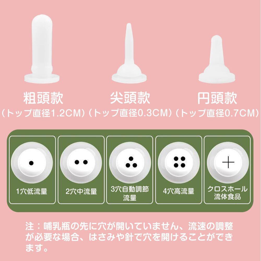 【調整可能】4種類のシリコン乳首が付属。穴の開いていない乳首は、使用前に好みのサイズに穴を開けられるため、子猫や子犬の成長段階や飲む力に合わせて調整可能です。