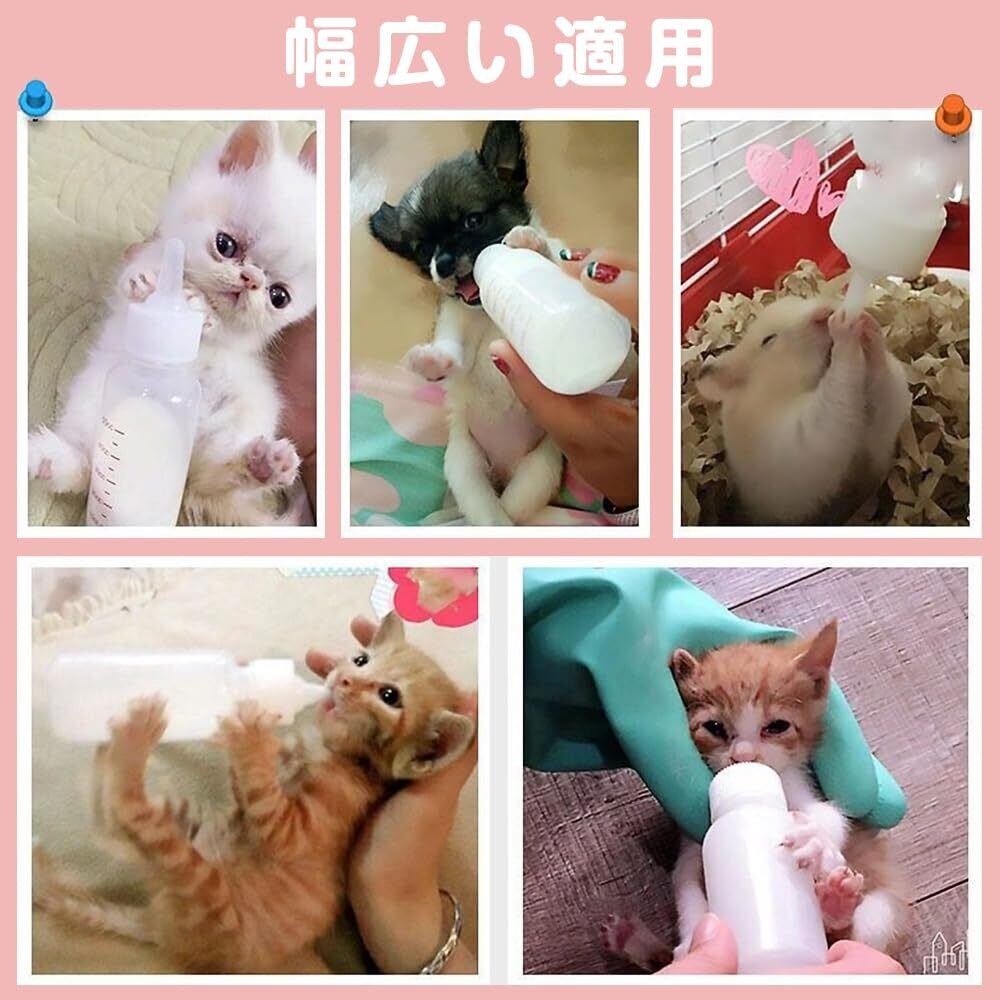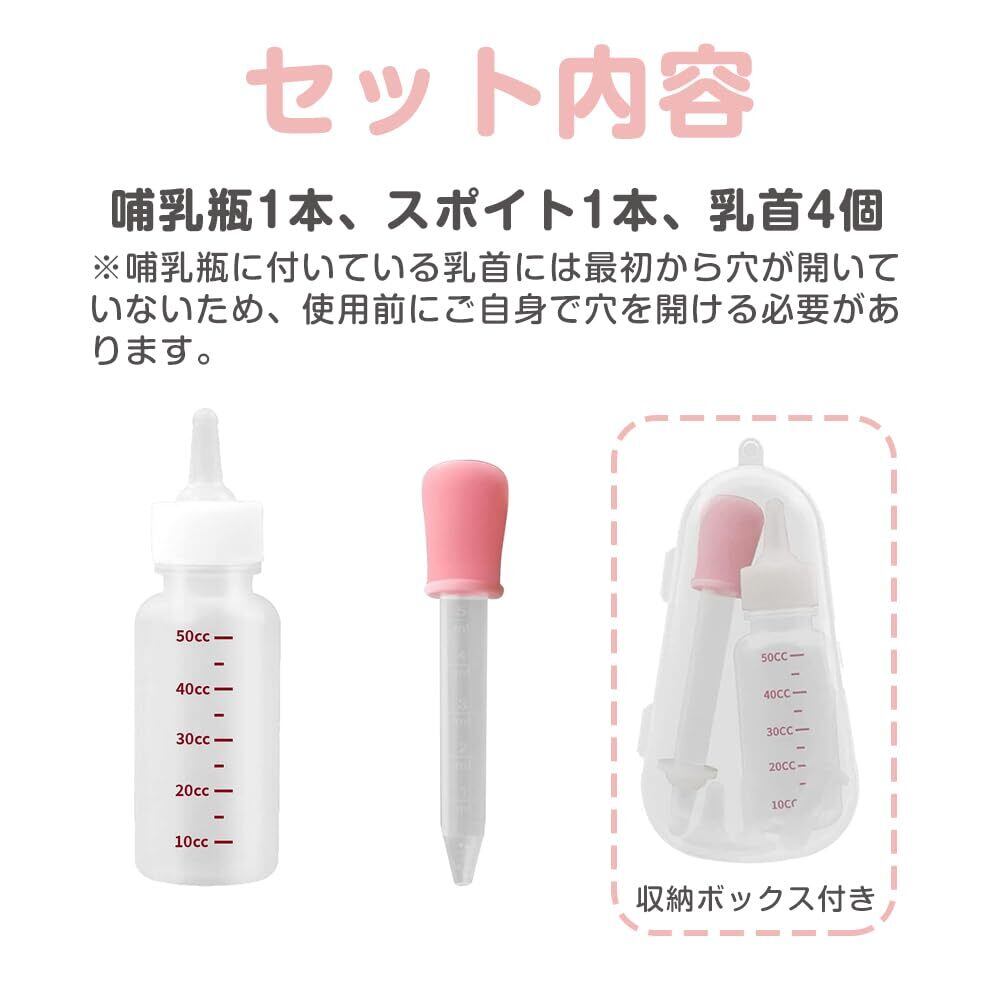 【セット内容】哺乳瓶1本、スポイト1本、乳首4個がセットになっており、子猫や子犬の哺乳・給餌に必要なアイテムが揃っています。
