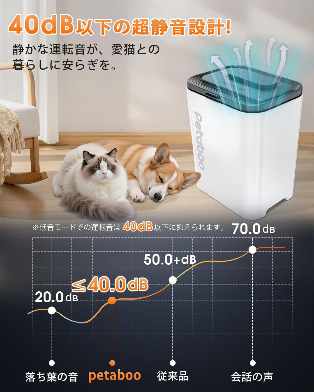【40dB以下の静音設計】本品は最先端の静音技術を採用し、エア抜き時の稼働音はわずか40dB以下です。睡眠中や作業中でも気にならず、生活の妨げになりません。飼い猫ちゃんにも安心の低騒音設計です。