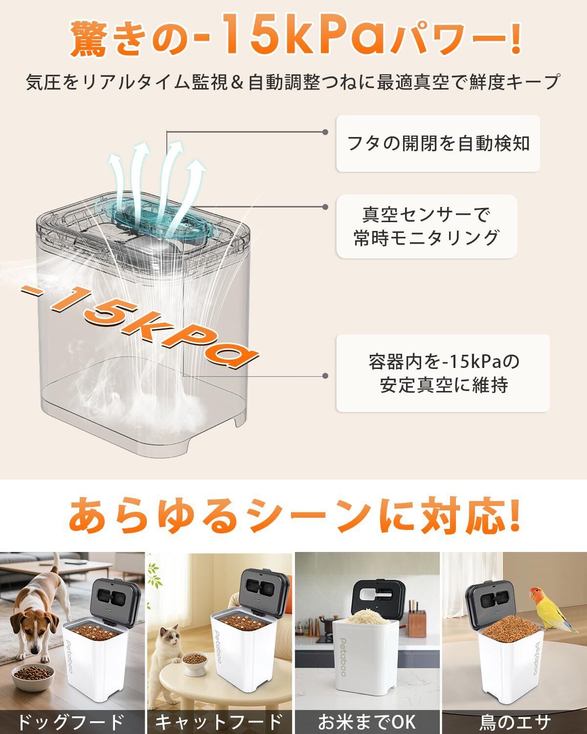 【自動真空&気圧調整で、鮮度12倍長持ち】2025年最新進化版の petaboo 真空保存容器ペットフード。圧力センサーを搭載し、容器内の圧力が -15kPa を下回ると自動的に圧力を調整して真空状態を維持します。一般的な密閉容器に比べて気密性に優れ、残留酸素や湿気も効果的に除去。空気と湿気を取り除くことで、食材の酸化や湿気による劣化を防止し、保存期間を最大12倍以上延長。常に乾燥した新鮮な状態を保ち、お米やペットフードの理想的な保存容器です。