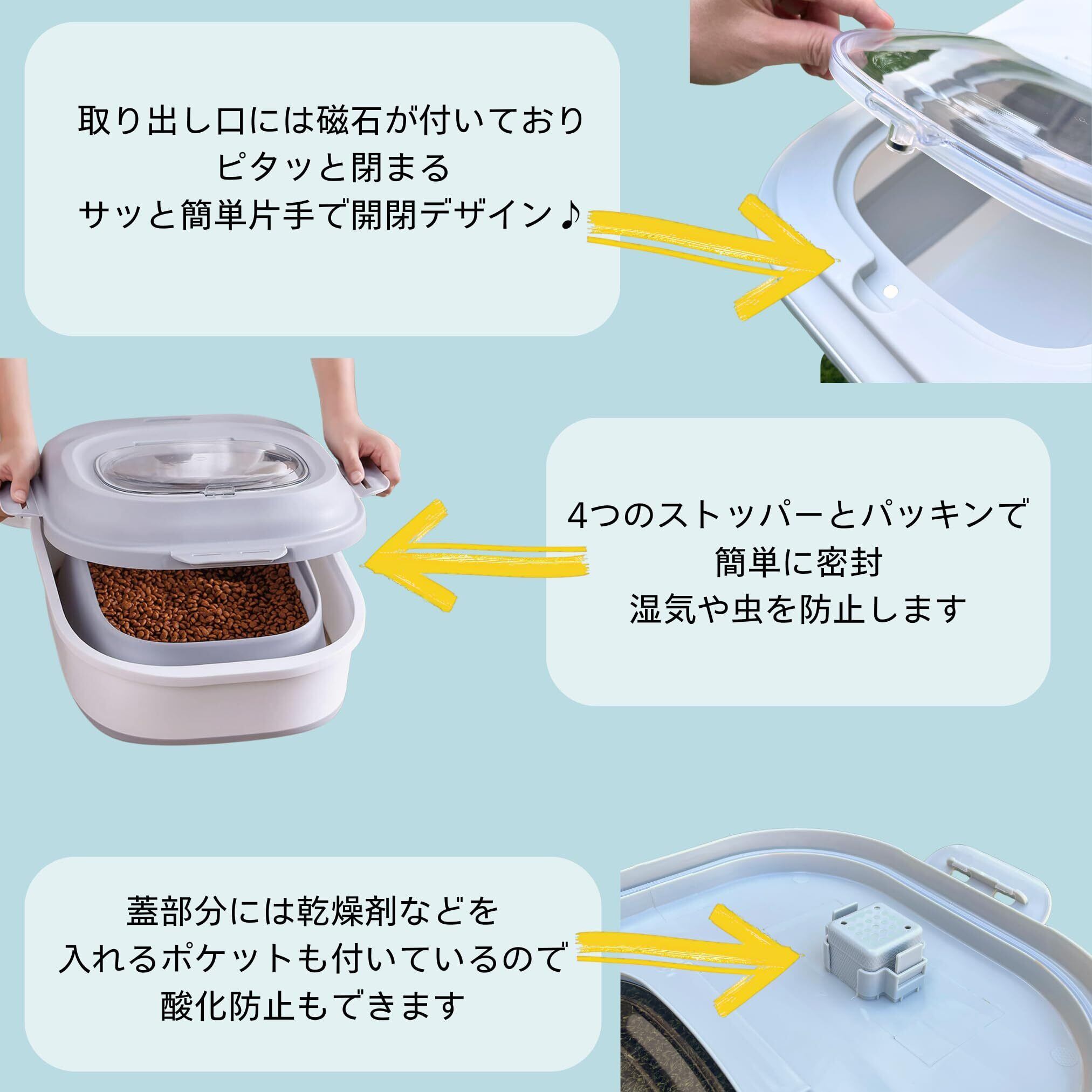 【スコップ&計量カップ付き!多用途に使える保存容器】 計量しながらフードをすくえるスコップ&計量カップ付きで、毎日の食事管理がラクになります。また、ペットフードストッカーとしてだけでなく、お米、粉物、キャットフード、ドッグフード、調味料などの保存にも最適な密閉容器です。