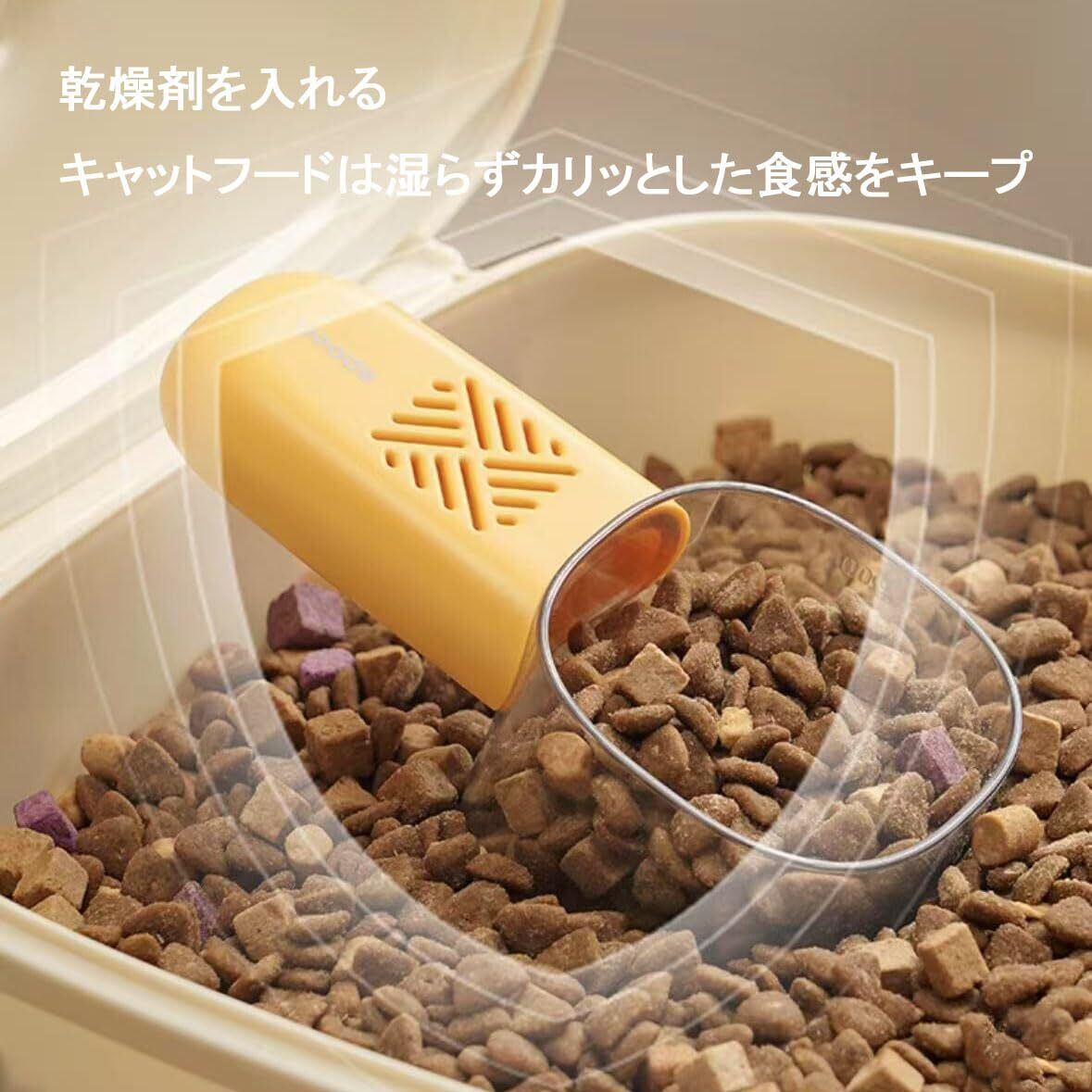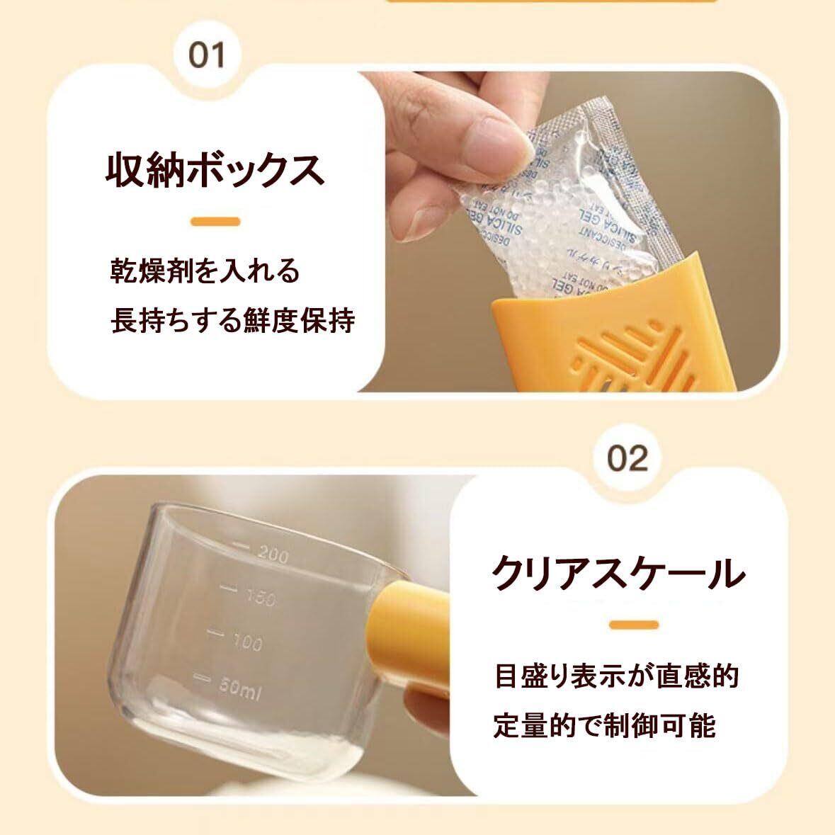 ハンドル内蔵の乾燥剤収納部:スプーンの持ち手部分に乾燥剤を入れられる仕様で、湿気対策が可能。フードの鮮度を長持ちさせます。