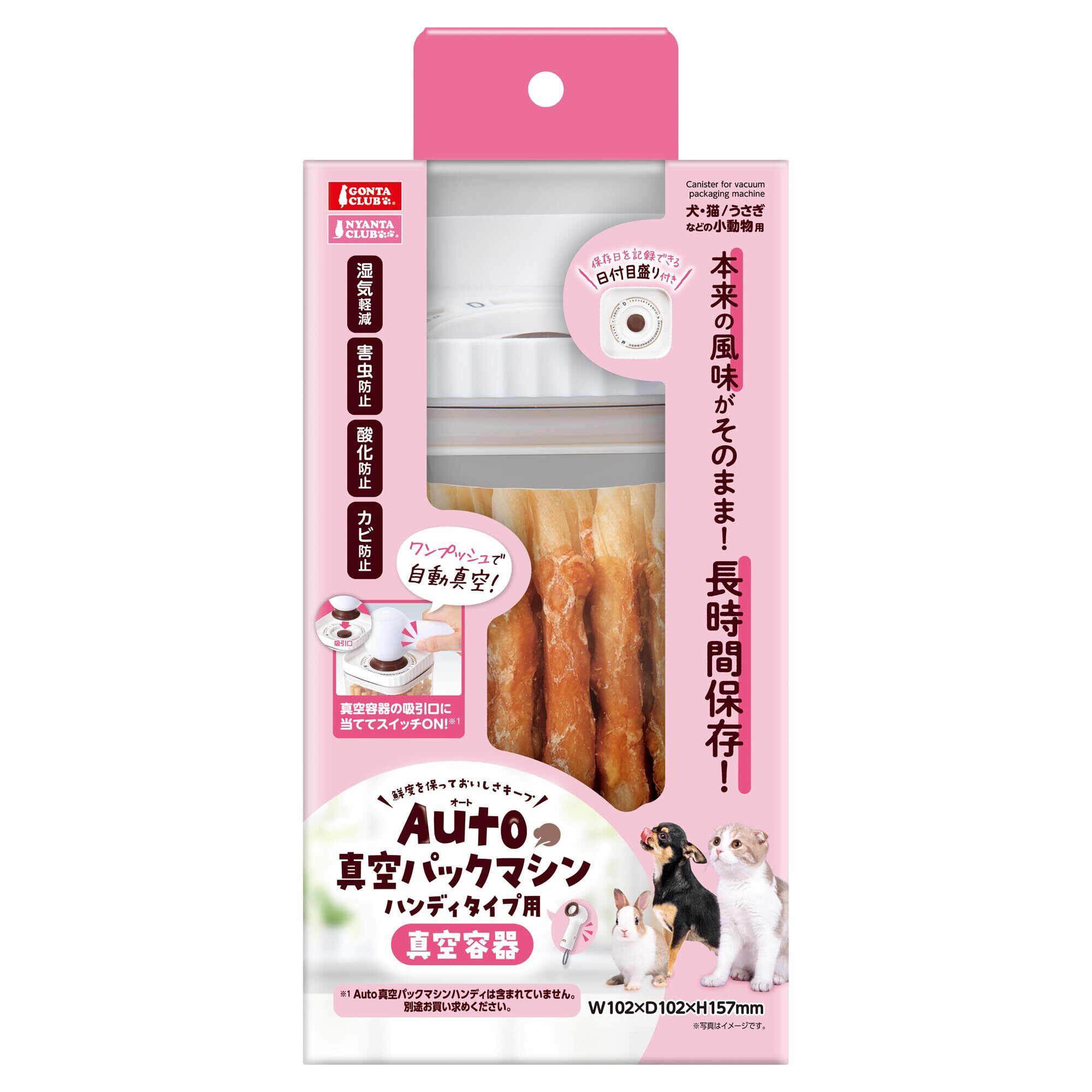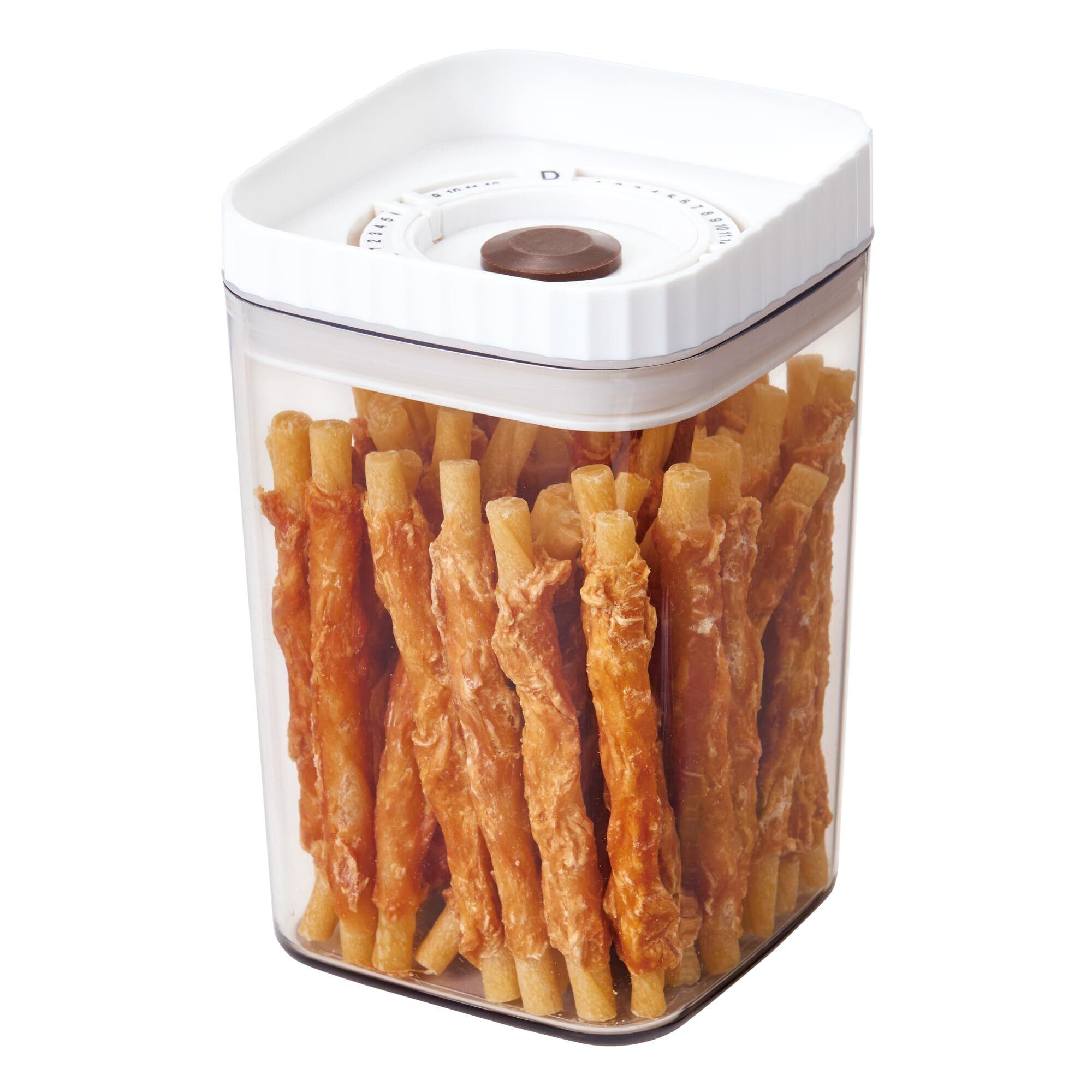 Auto真空パックマシンハンディタイプ専用の真空保存容器。900mlの大容量で、ペットフードやおやつなどを酸化・湿気・カビ・害虫から守り、美味しさと鮮度を長く保ちます。使い方も簡単で、吸引口にマシンを当ててスイッチを押すだけ。保存日がわかる日付目盛付きです。