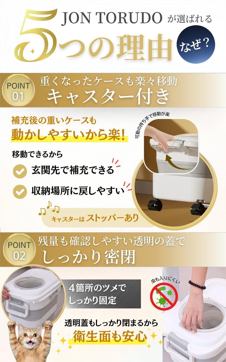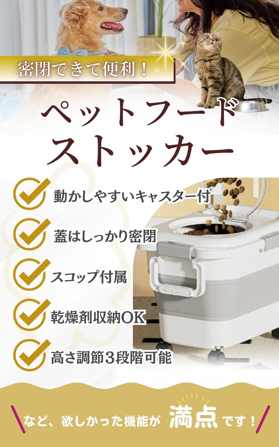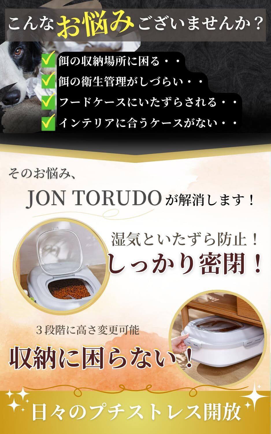ペットフードの袋をそのまま置いていませんか? 湿気・ニオイ・虫混入で、せっかくのフードが台無しに…。 JON TORUDO ペットフードストッカーなら、 密閉・可動・収納すべてがこれ1台で完結。 重いフード袋もラクに移動でき、毎日の「補充ストレス」を解消します。