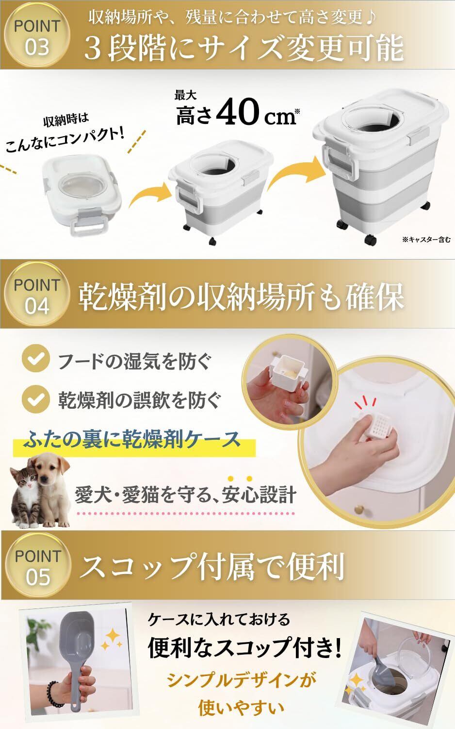 【3段階高さ調整で省スペース】 折りたたみ構造で、収納場所やフード量に応じてサイズ調整可能。未使用時は約10cmのコンパクトサイズに。