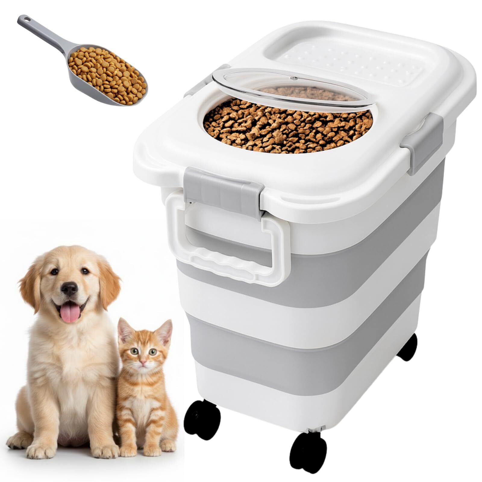 JON TORUDO ペットフードストッカー 大容量 15〜17kg キャスター付き 密閉容器 折りたたみ式 乾燥剤ケース&スコップ付き ドッグフード 保存容器 キャットフード ライスストッカー 収納ボックス (ライトグレー)