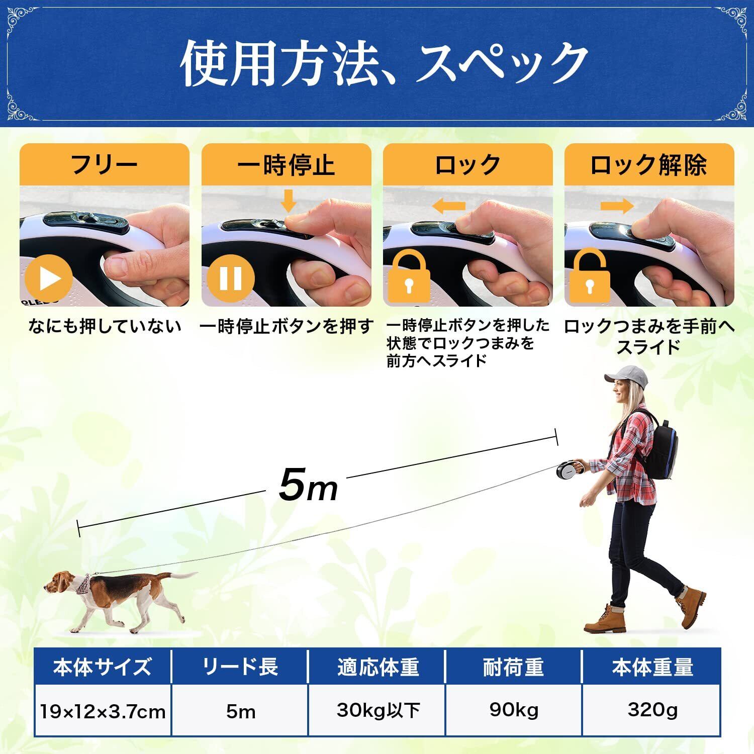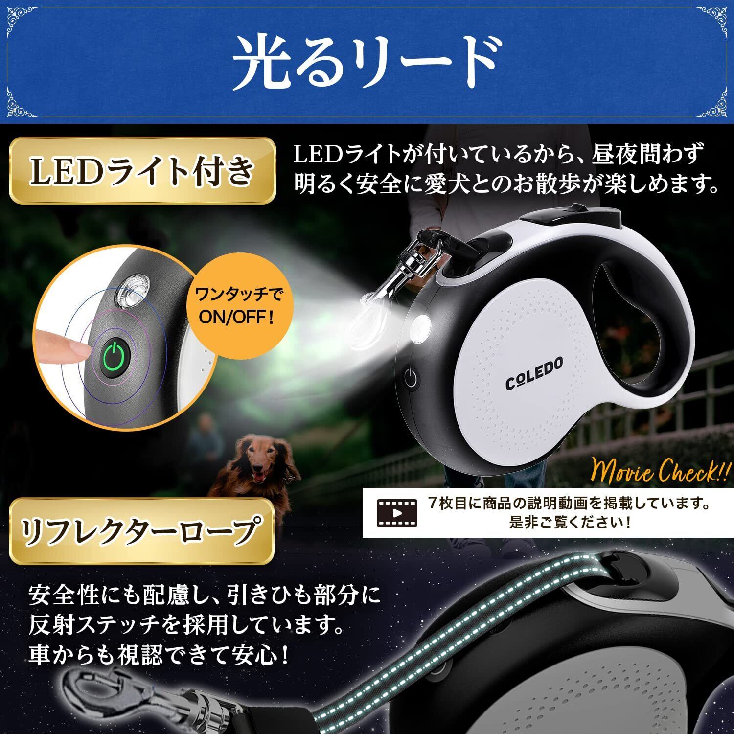 COLEDO 犬 リード 伸縮 ライト付き 5m 小型犬 中型犬 大型犬 充電式 【リード最長 : 5メートル 耐荷重 : 30kg】