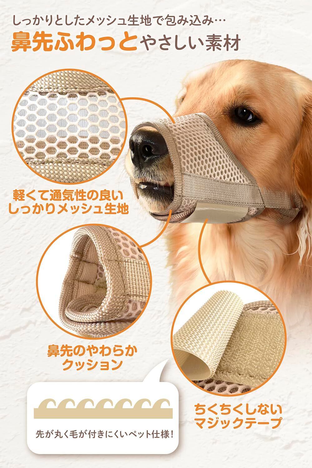 愛犬にも優しい口輪 : 思いやりは愛犬にも伝わるからしっかりメッシュ生地と鼻先ふんわりクッションでふわっと包みこむ思いやり構造。マジックテープは触ってもチクチクしない、毛もつきにくいペット仕様です。