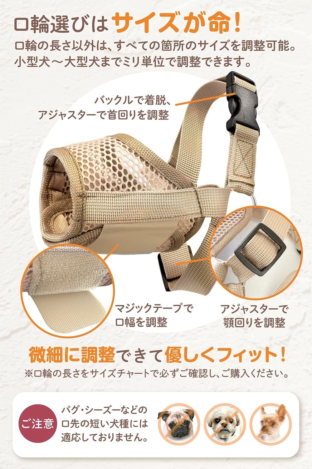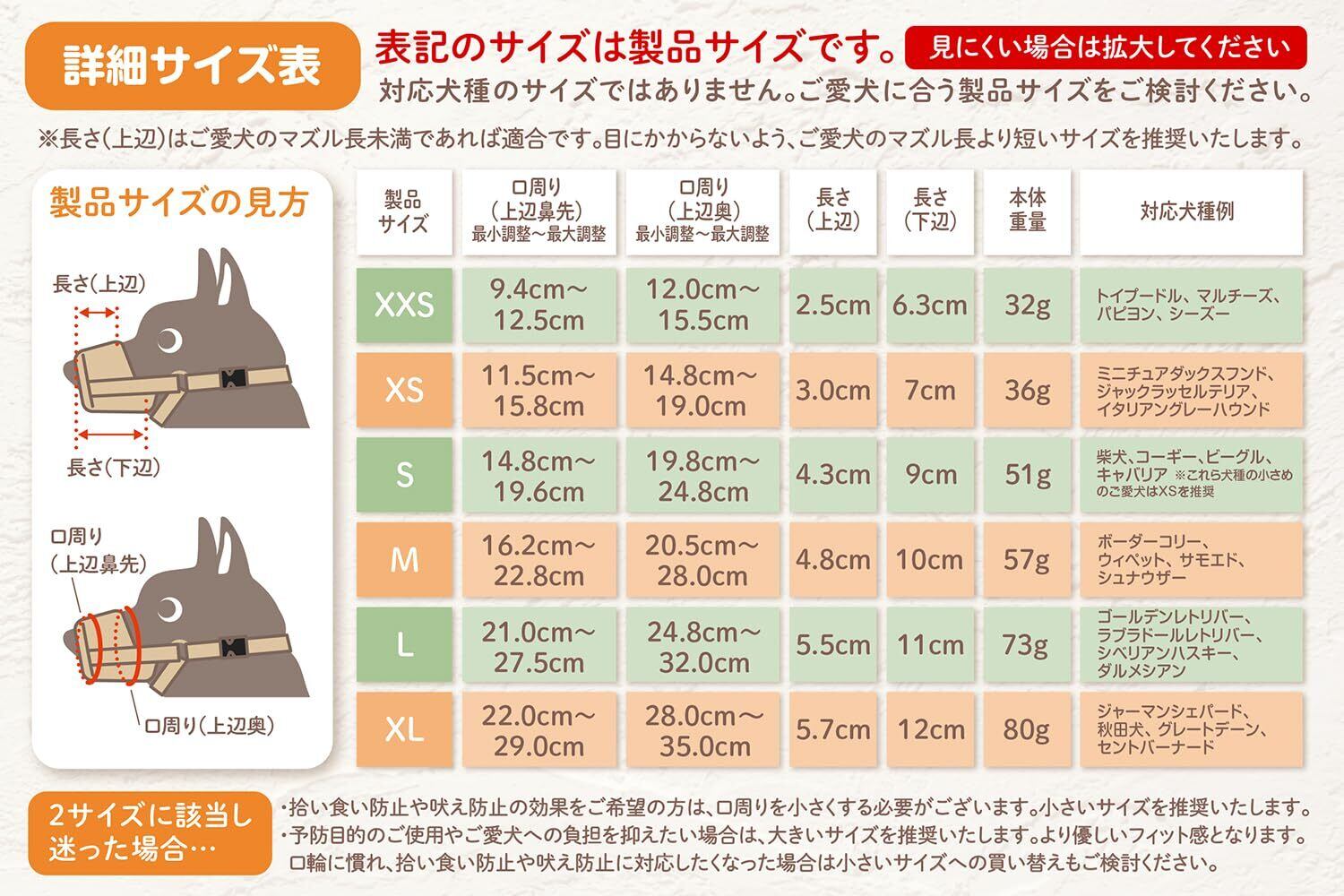 口輪選びはサイズが命 : 口輪の長さ以外はすべての箇所のサイズを調整できます。小型犬〜大型犬まで1mm単位で調整可能です。細かなサイズはしっかりとサイズチャートを元にご購入前に必ずご確認ください。
