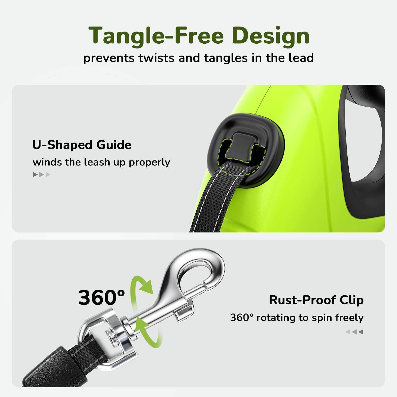 【頑丈な素材】 シェルは頑丈なABSプラスチックと亜鉛メッキ合金フックで作られ、錆びにくく、屋外活動に適しています。リーシュは高強度ポリエステル繊維+反射スチールワイヤーロープで作られており、丈夫で耐摩耗性に優れ、滑らかで引っかかりません。愛犬がリードを噛んだり、長時間地面をこすったりするのを防ぎ、使用時間を短縮します。