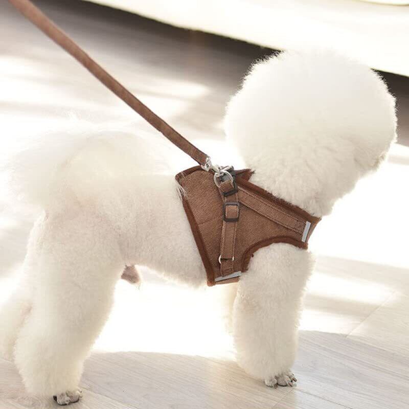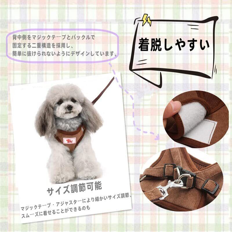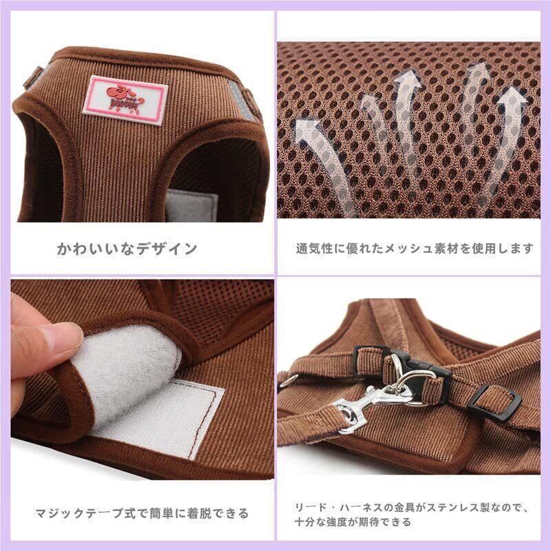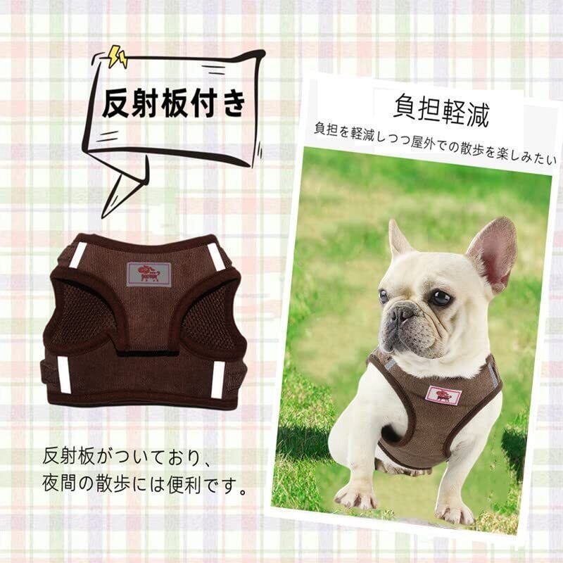 BBGS ペットハーネス 犬用ハーネス 胴輪小型犬 猫用 セット リード おしゃれ 可愛い 人気 咳き込み軽減 通気性 簡単着脱 首輪 夜間反射テープ 安全 ハンドル付き 調節可能 両肩を通すタイプ ウェアハーネス お出かけ散歩 外出 通院 避難 (M, ブラウン)