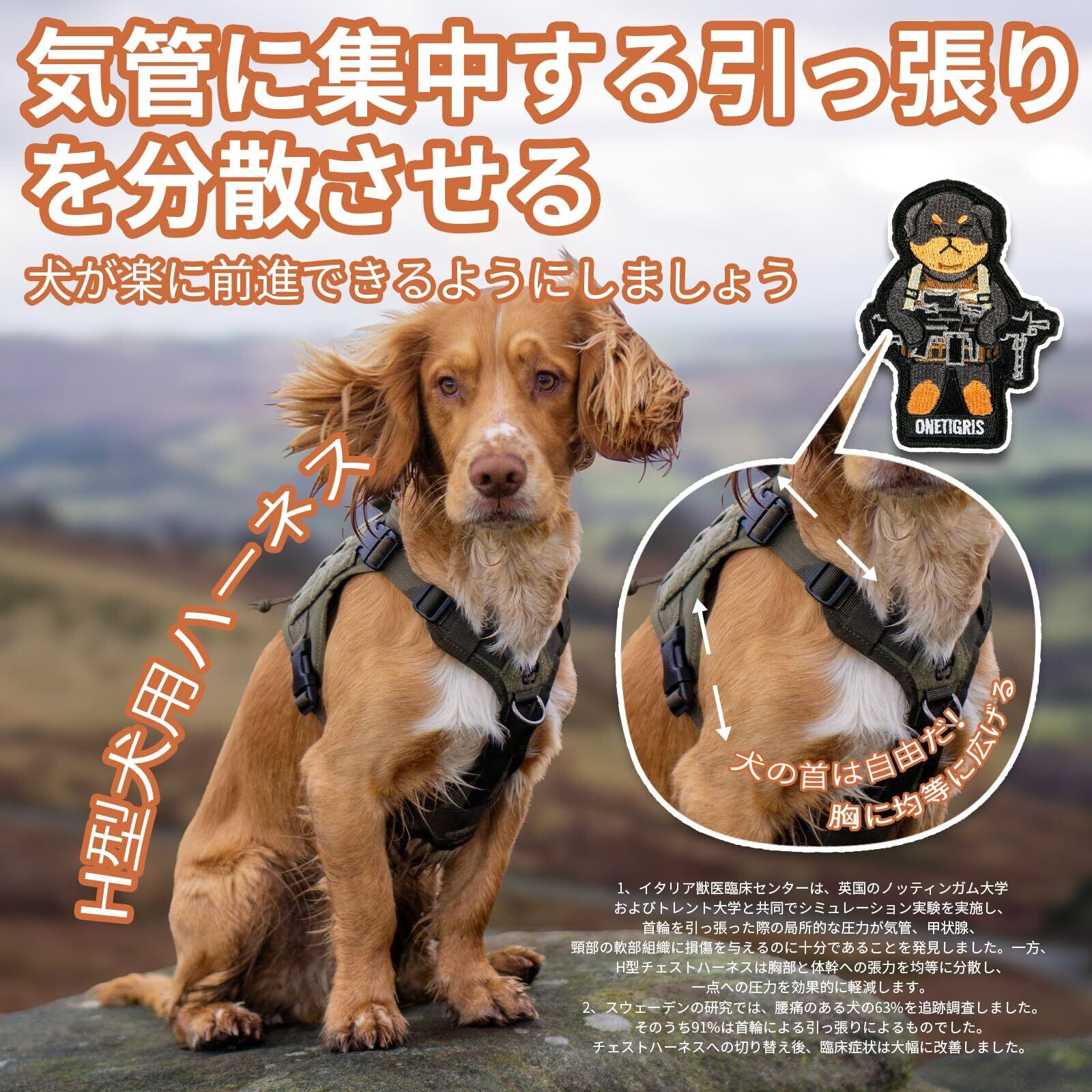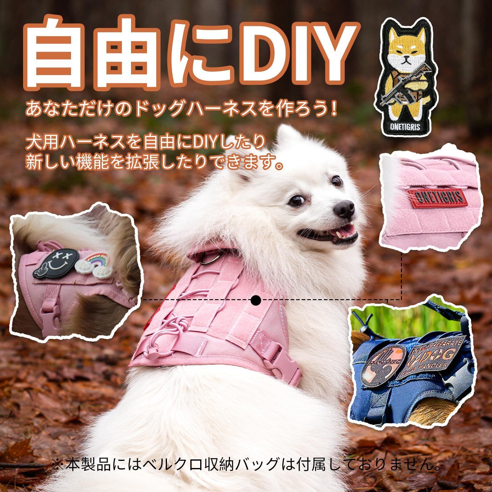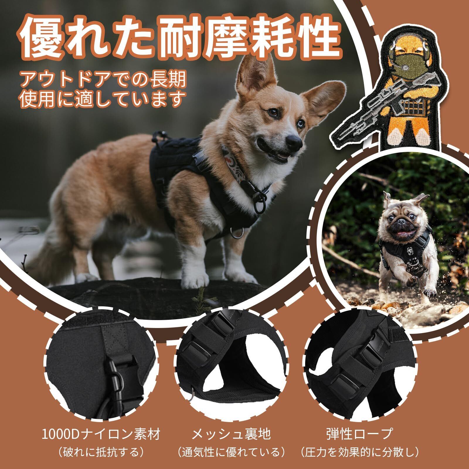 【おしゃれで個性的なスタイル】MOLLEマジックテープモジュールシステムを装備し、愛犬のスタイルに合わせてカスタマイズ可能。ワッペンを変えることで毎日の気分に合わせたおしゃれな演出ができ、スナックバッグやおもちゃポーチなどの装着も可能。ハーネス 犬としても実用性抜群で、個性的な犬用ハーネスをお求めの方に最適です。