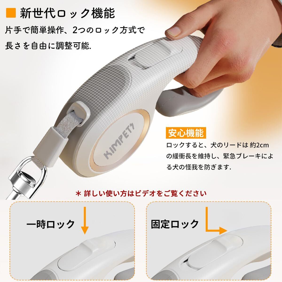 【新世代ロック機能】人間工学に基づいたC型の快適な滑り止めハンドル、片手で簡単に操作でき、一時ロックと固定ロックの2つのロック方法で犬用リードの長さを自由に調整できます。安心機能:ロックすると、犬のリードは 約2cm の緩衝長を維持し、緊急ブレーキによる犬の怪我を防ぎます「詳しい使い方はビデオをご覧ください 」