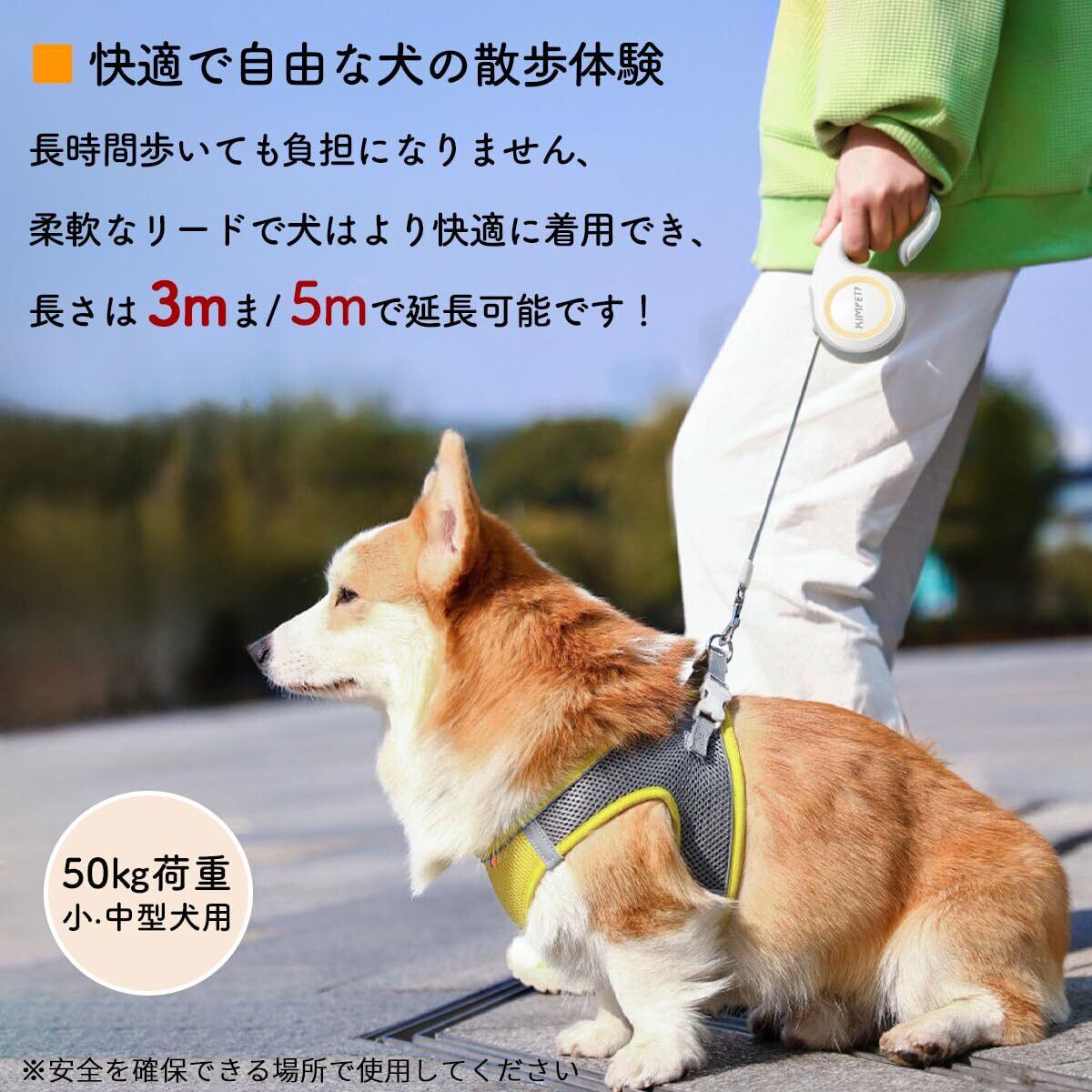 【軽量・コンパクト設計】自動巻き取り式犬用リードは3メートル/5メートルまで伸ばすことができ、非常に軽くてコンパクトなので、長時間の散歩でも負担になりません。 柔らかいなリードはペットにとって快適です。持ち運びが簡単で子供、お年寄り、女性でも楽に使えます、ペットと一緒にゆったり快適なお散歩をお楽しみください。
