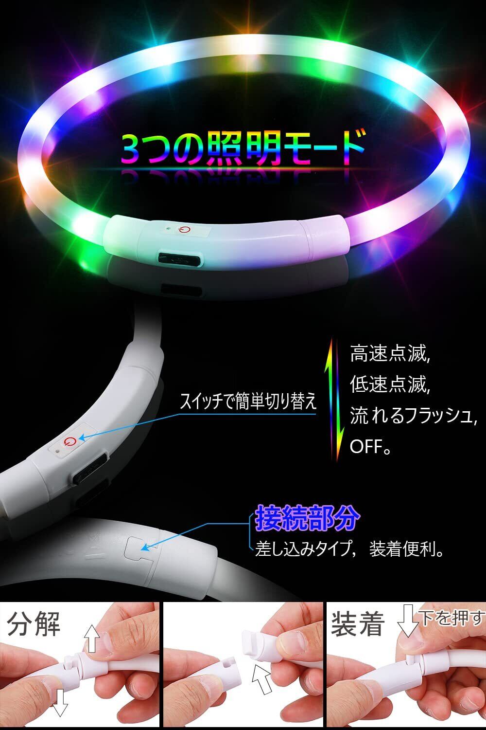 【調整可能なの首輪】各ライトアップ犬の首輪の長さは70cmで、はさみで好きな位置にカットして長さを調節することができます。猫、小型犬、中型犬、大型犬に対応可能となります。カット後長くなることはありませんのでご注意ください。はさみでにカットし前に首周りのサイズ測定をお願いします。