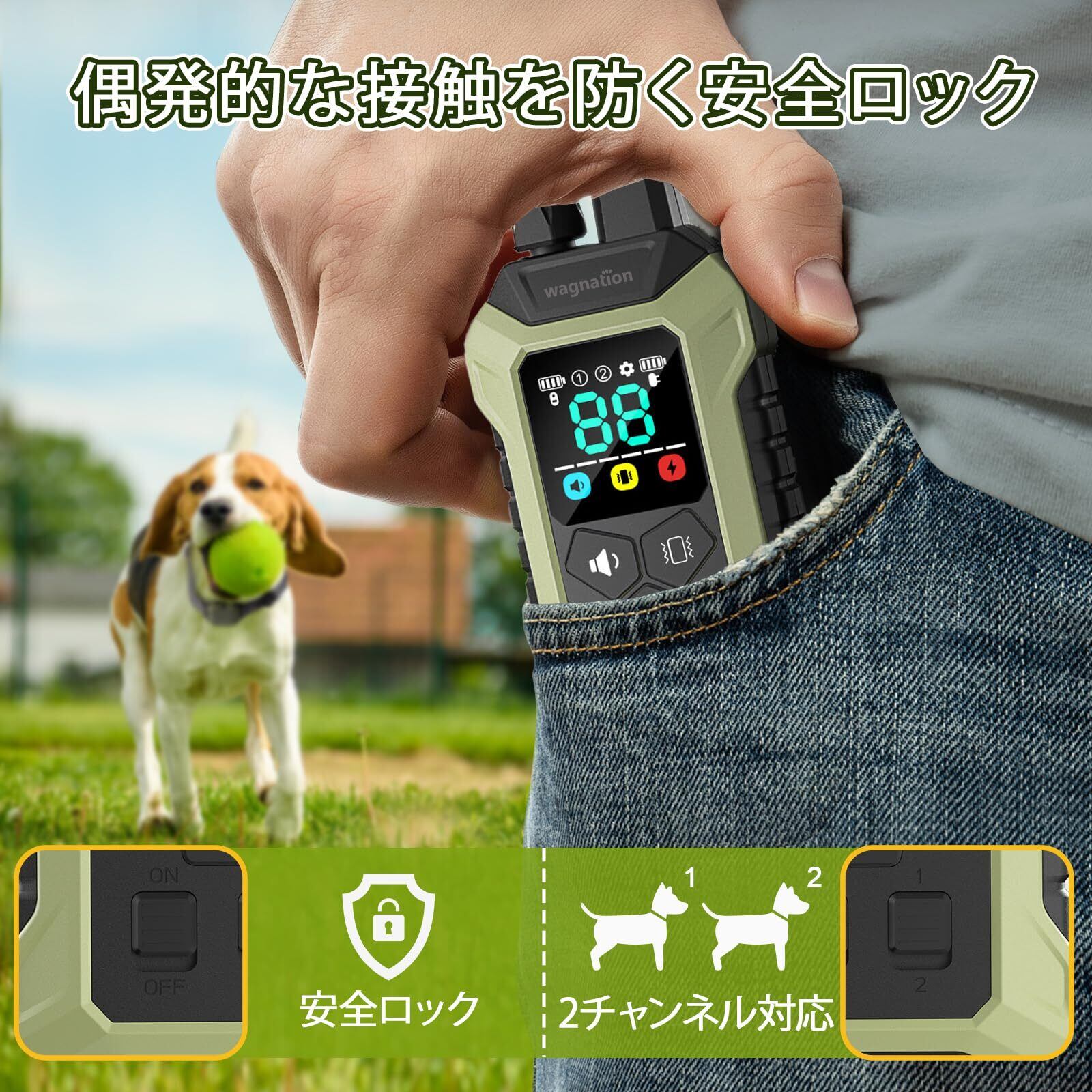 【リモコン操作・LCDディスプレー】リモートコントロール距離は最大1200メートルで(障害物や干渉なし)、公園の芝生で散歩する時にも遠隔訓練できます。セキュリティキーロックボタンは、リモコンを持ち運ぶときに誤って押すことを防止することができます。ロックされると首輪に指示を出されないので、誤動作で愛犬に傷つくことが避けられます。振動、静電気、警告音のレベルは安全範囲内に設定されており、正しい使用方法とトレーニング方法で無駄吠えや噛み癖の改善に応用すれば、安全上問題ありません、安心にご利用いただける犬無駄吠え対策グッズです。LCDディスプレーも付いてあり、使用モード、レベル、首輪とリモコン電池残量なども表示され、一目瞭然です。リモコンの操作ボタンがとても分かりやすい、年配の方も簡単に操作できます。