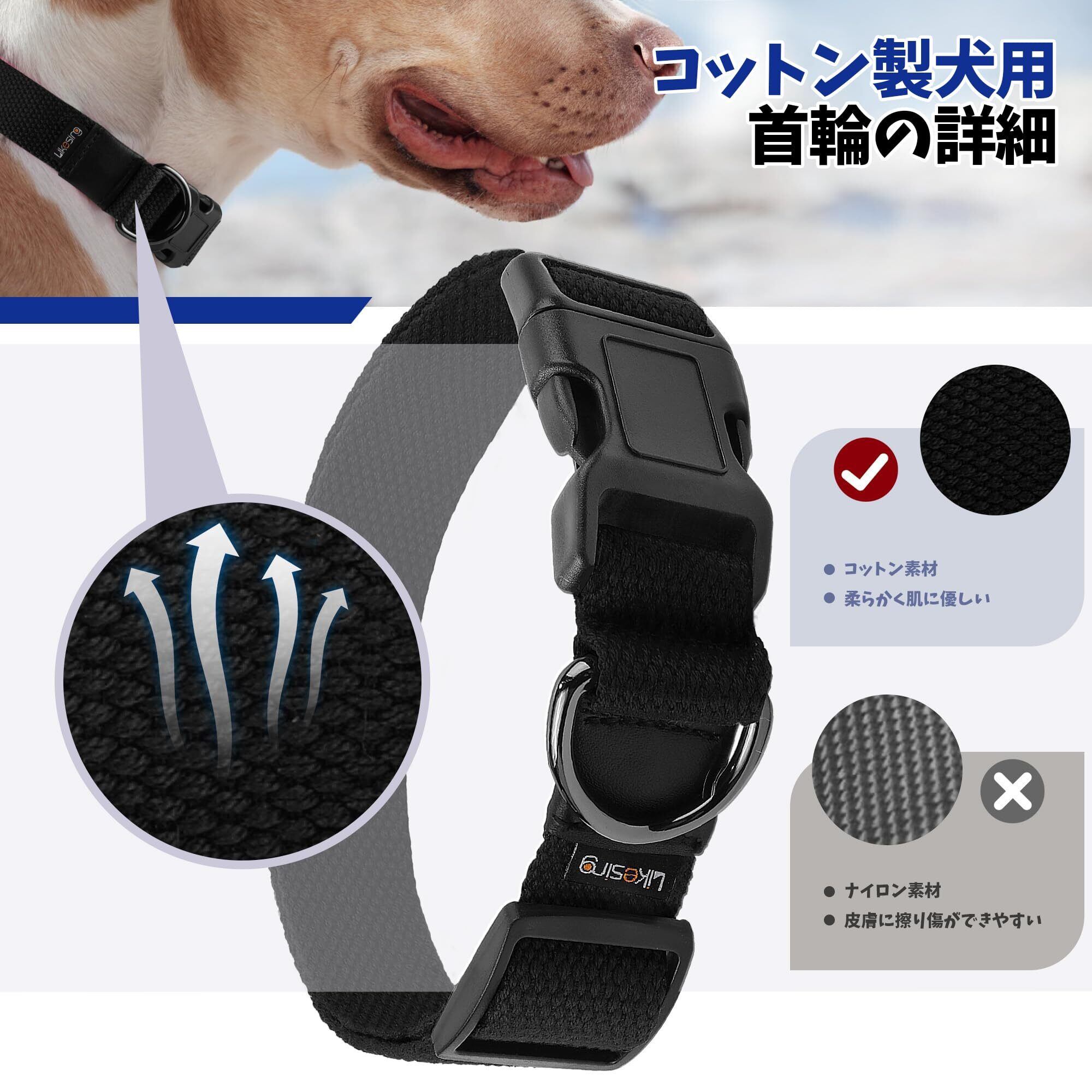 Likesing 犬 首輪 小型 犬の首 輪 コットン製 犬用首 輪 小型、中型、大型犬 ソフト 肌に優しい 丈夫 負担がない 通気性 訓練 散歩 クイックリリース ドッグカラー バックル付き 調節可能 装着簡単 (Black, XS(20~30cm,幅2cm))