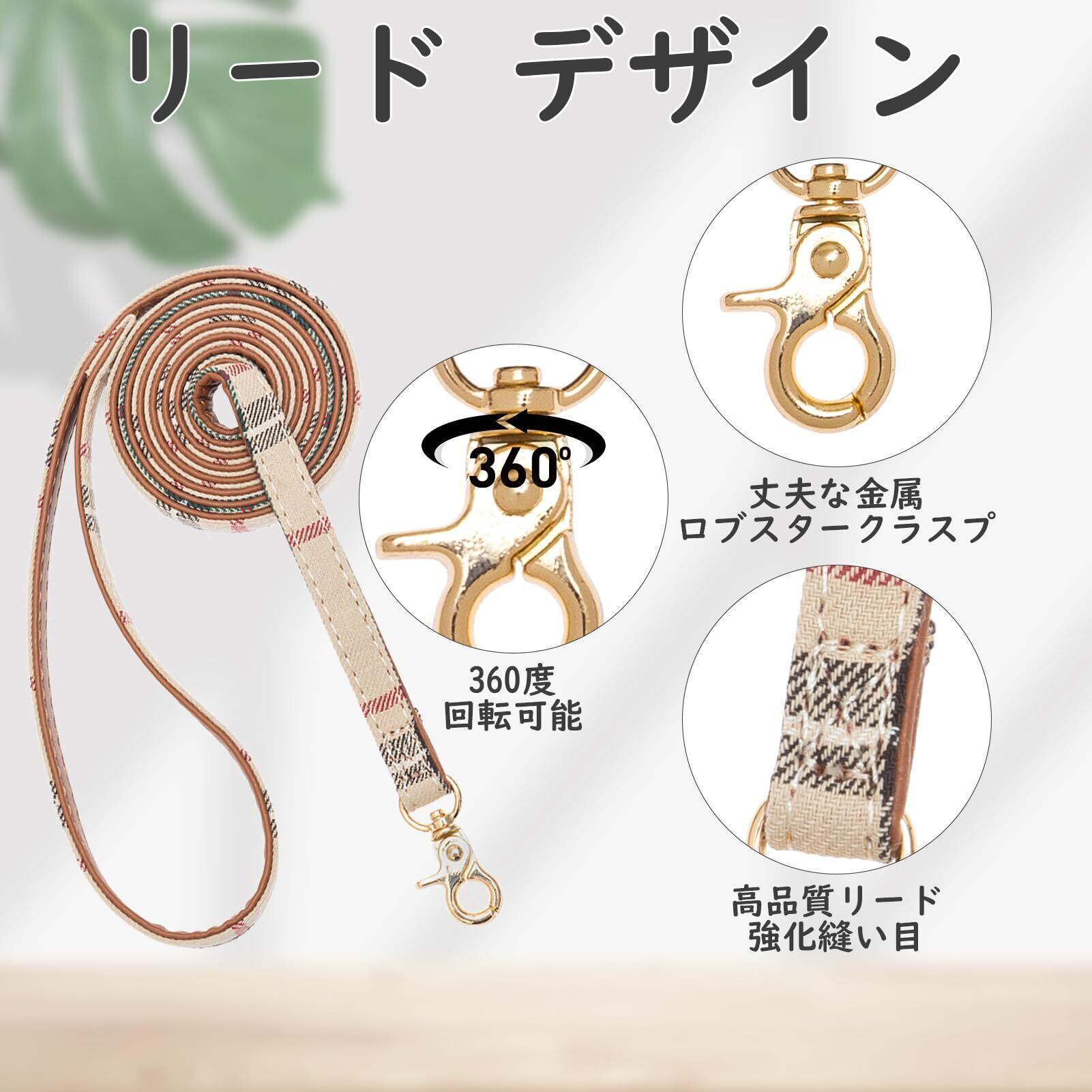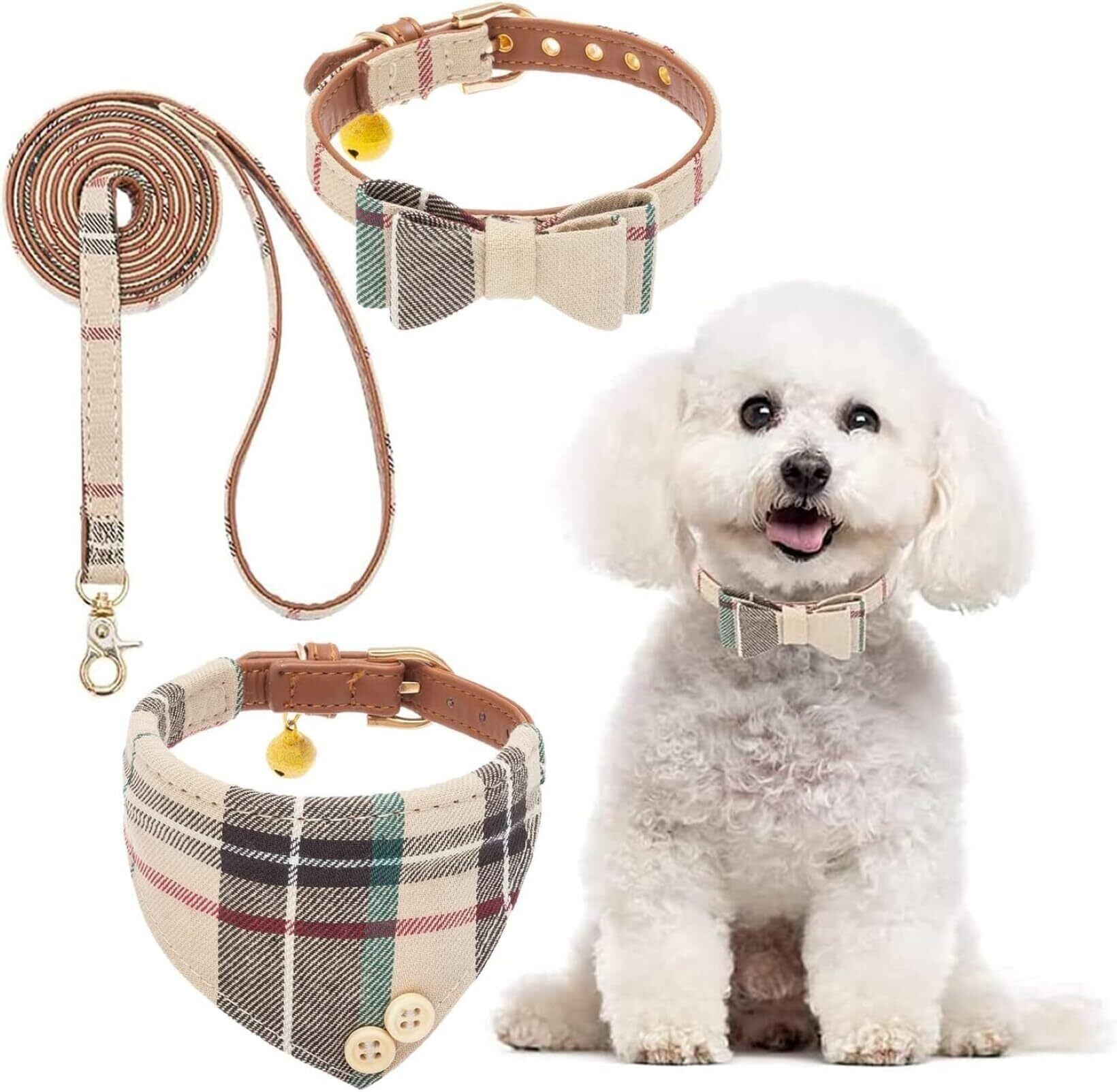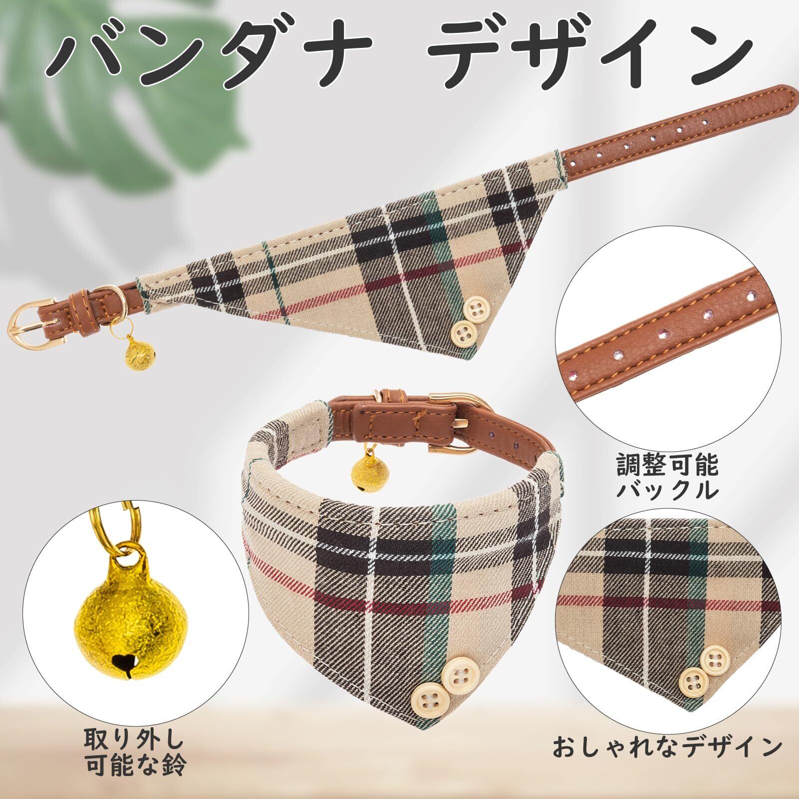 BINGPET 犬 首輪 バンダナ リード セット 犬の首輪 鈴付き 犬 リード ベーシック首輪 チェック 調節可能 革製 柔らかい かわいい おしゃれ 超軽量 通気性 ハンドル付き 胴輪 散歩 出かけ 金属リング メッシュ 猫 ねこ キャット しつけ 訓練 散歩 ペット用品 子犬 小型犬 中型犬 大型犬 柴犬 秋田犬 (ベージュ, S)