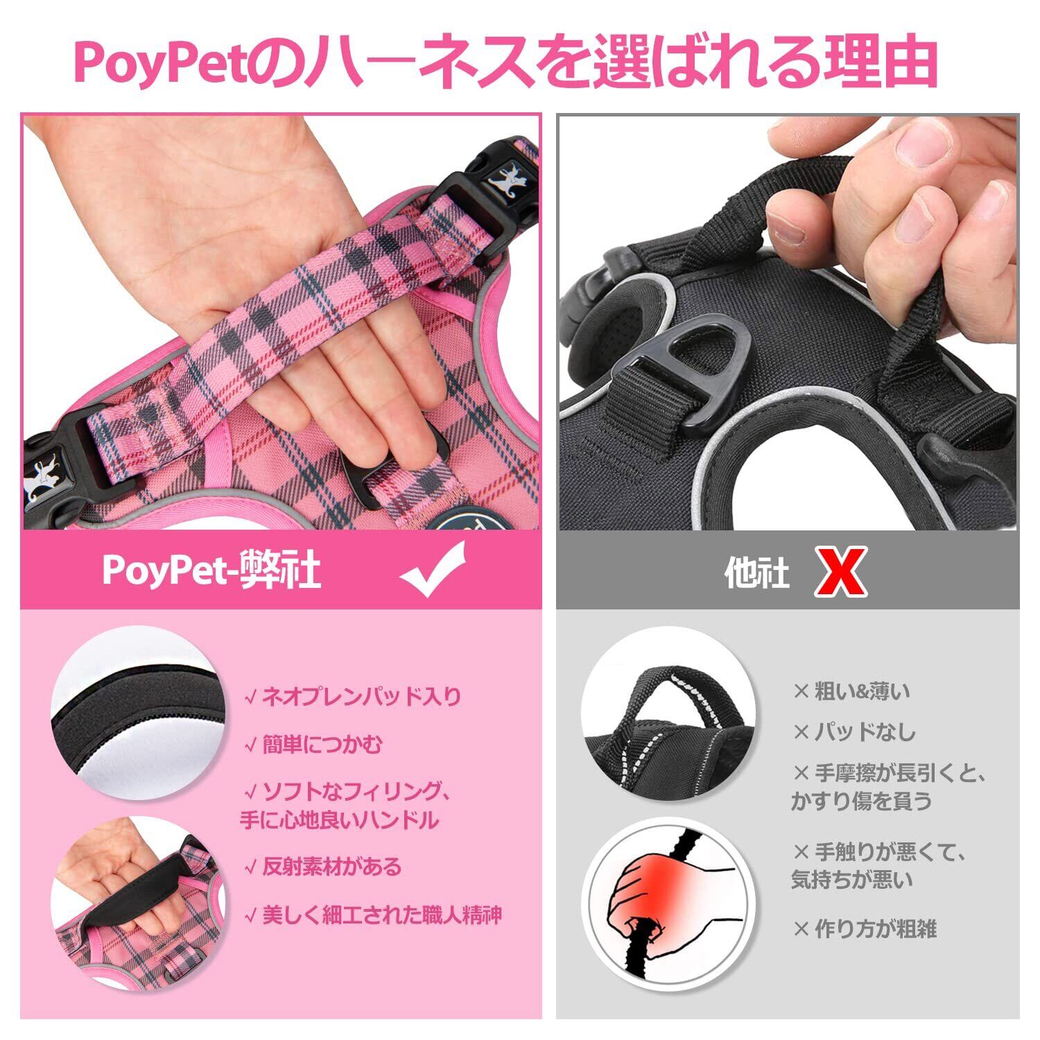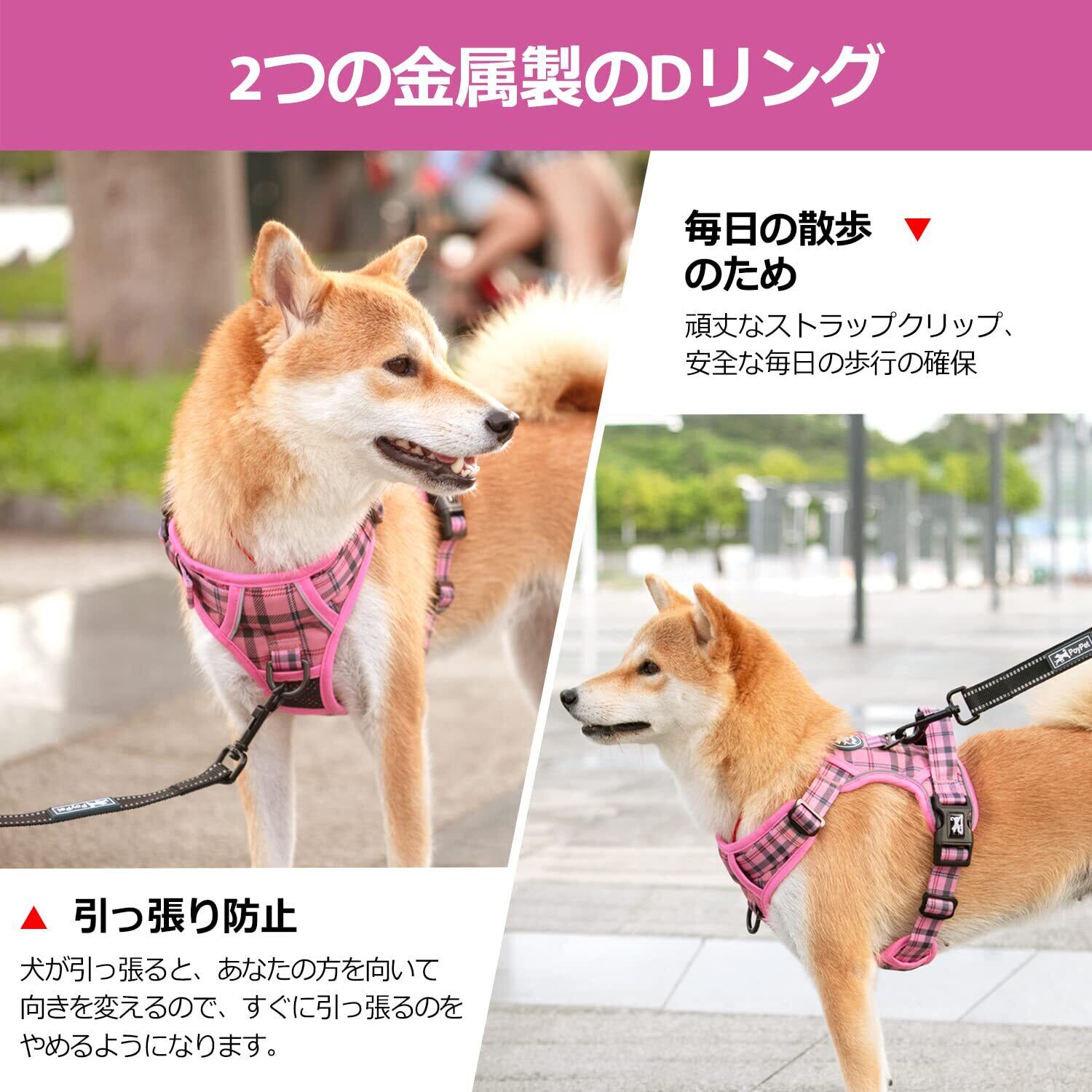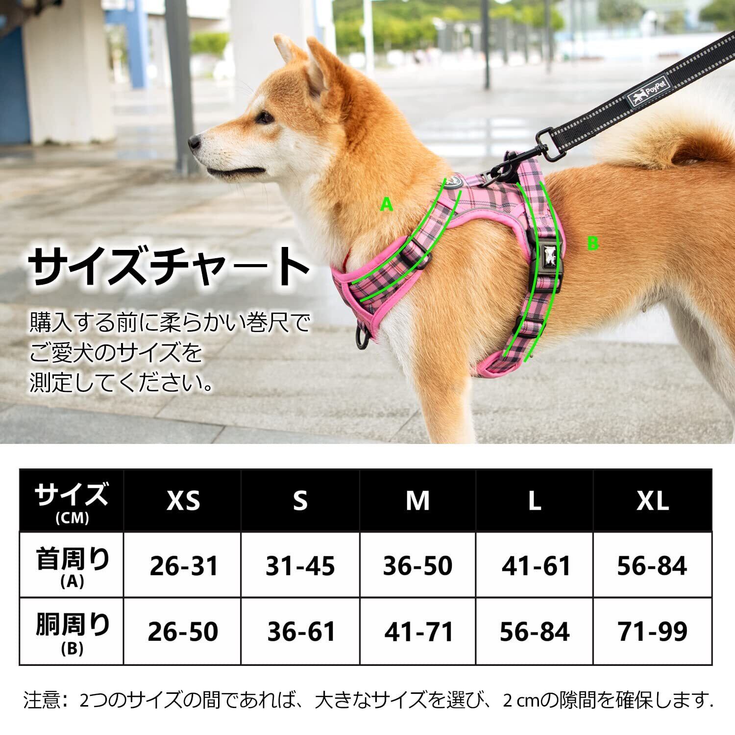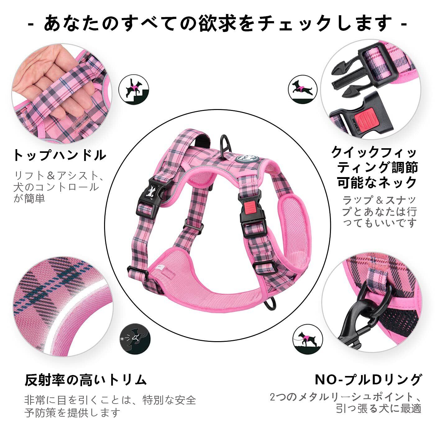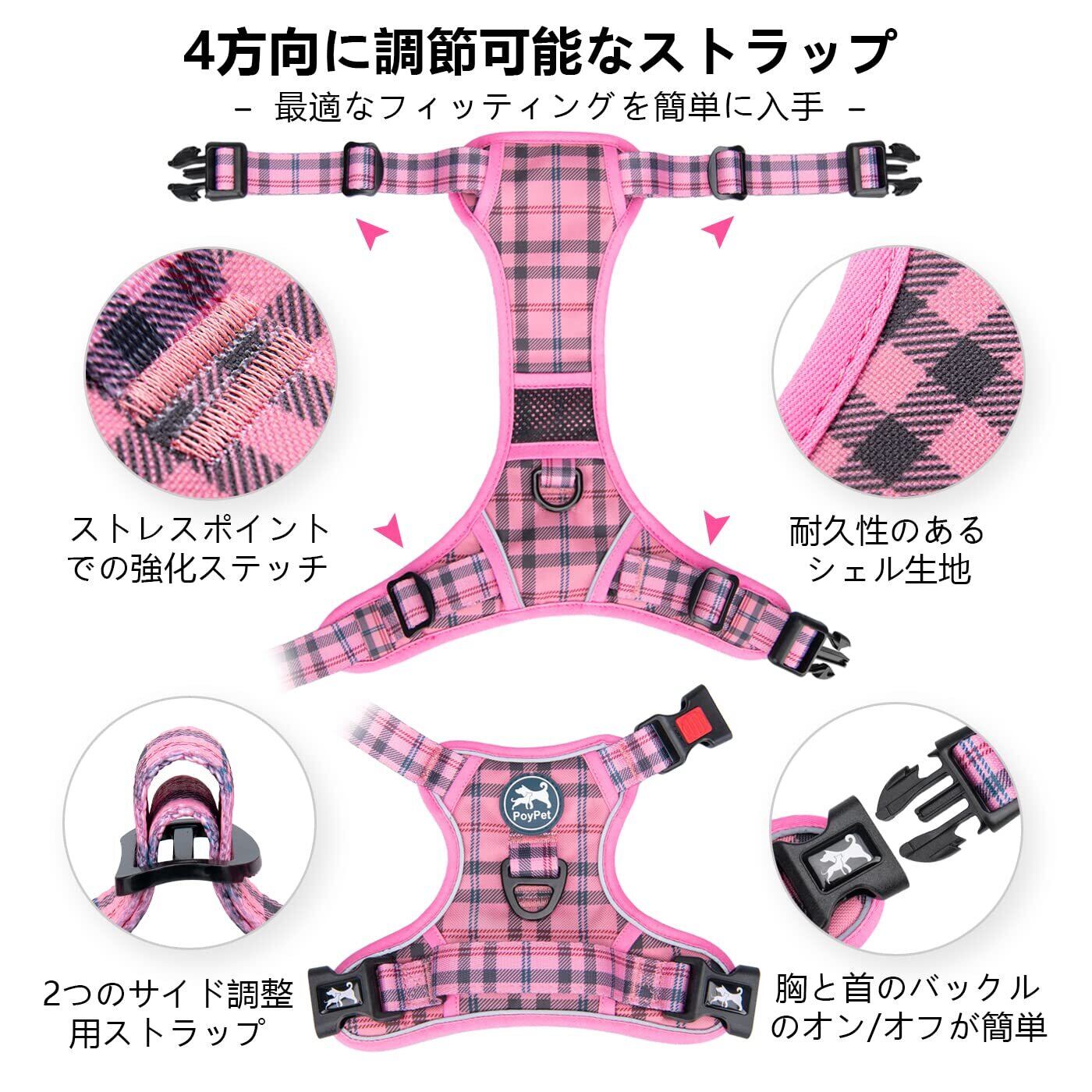 PoyPet 犬 ハーネス 胴輪 引っ張り防止 首が開ける 簡単着脱 咳き込み軽減 抜けない 前後Dリング付き ハンドル サイズ調整可能 ソフト 散歩 訓練 しつけ用 小型犬 中型犬 大型犬(ピンク格子,S)