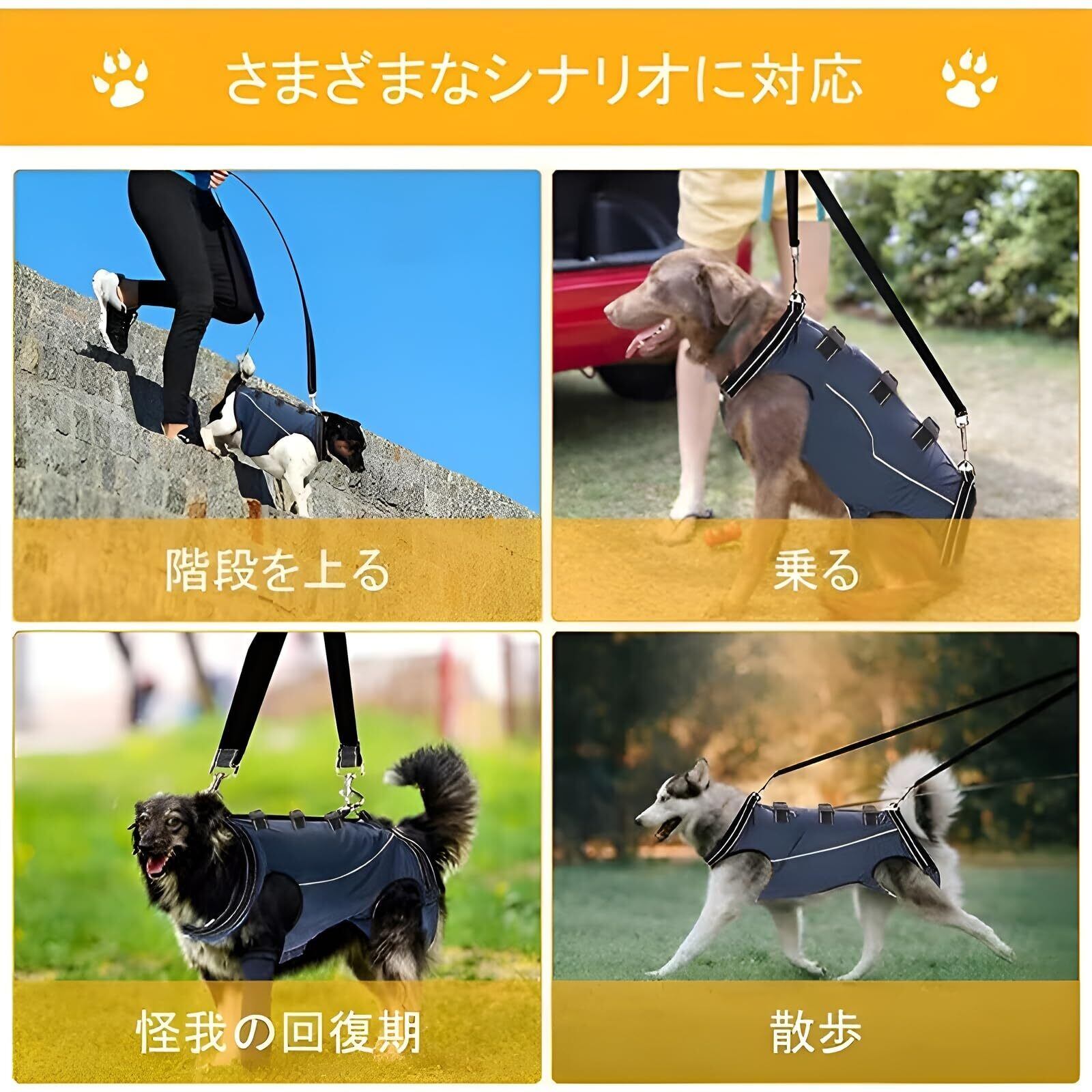 【多用途で幅広く活躍】老犬の歩行補助やリハビリ、怪我や手術後のサポート、関節炎や足腰の弱ったワンちゃんの日常介護に最適。階段の上り下り、車の乗り降り、毎日のお散歩も快適にサポートします。