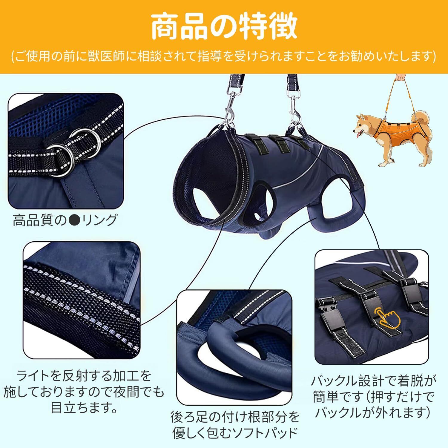 【全身サポートデザイン】新しいデザインで、犬にかかる力を全身に分散。犬のストレスを軽減し、後ろ足部分に柔らかいパッドを内蔵。ペットの体を全面的にサポートしながら、日常の活動やトイレ利用にも影響しません。反射材付きで、夜間の散歩や暗い環境でも安心。