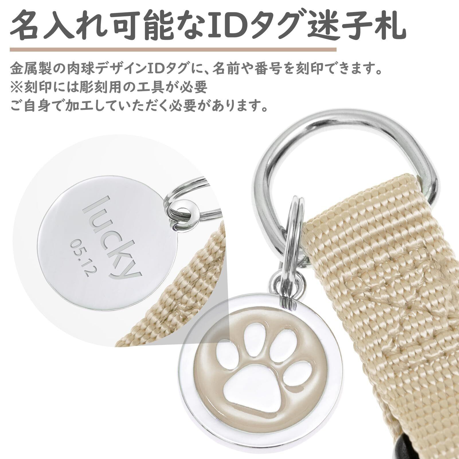 【可愛い迷子札IDタグ付き】:可愛らしい肉球デザインの金属製IDタグ付き。裏面には愛犬の名前や連絡先を刻印でき、木製タグのように腐食しにくい仕様です。万が一の迷子対策にも役立ちます。また、洗濯時には簡単に取り外せるので、お手入れも簡単。愛犬の安全とおしゃれを両立する便利なアイテムです。