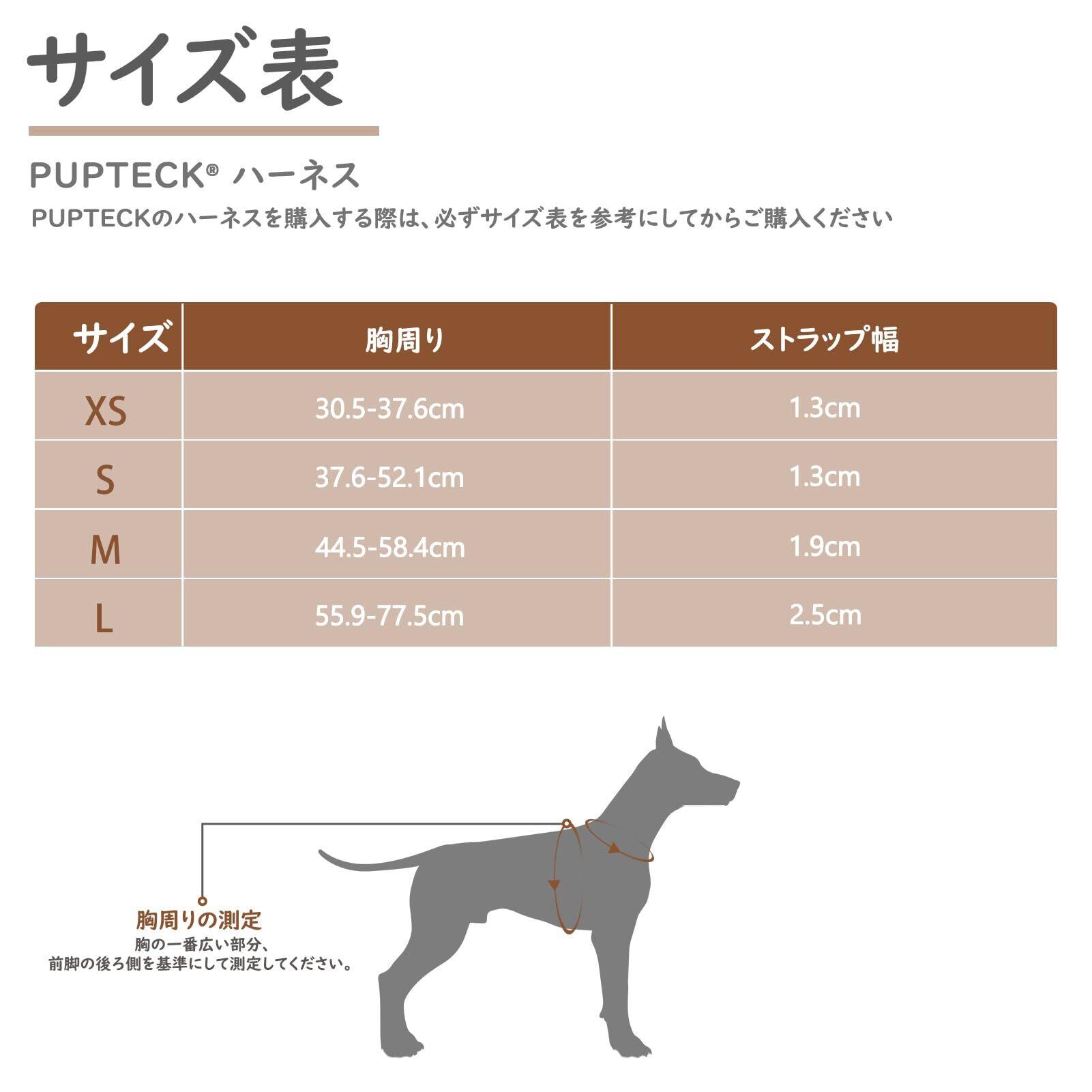 【サイズ】:愛犬の体型に合わせて選べる4サイズ「XS:胴回り 30.5-37.6cm、ストラップ幅 1.3cm」「S:胴回り 37.6-52.1cm、ストラップ幅 1.3cm」「M:胴回り 44.5-58.4cm、ストラップ幅 1.9cm」「L:胴回り 55.9-77.5cm、ストラップ幅 2.5cm」購入前に必ず愛犬のサイズを測定し、適切なサイズをお選びください。 ※ご注意:本製品は噛みつき防止仕様ではありません。愛犬が一人でいる際は、必ずハーネスを外してください。