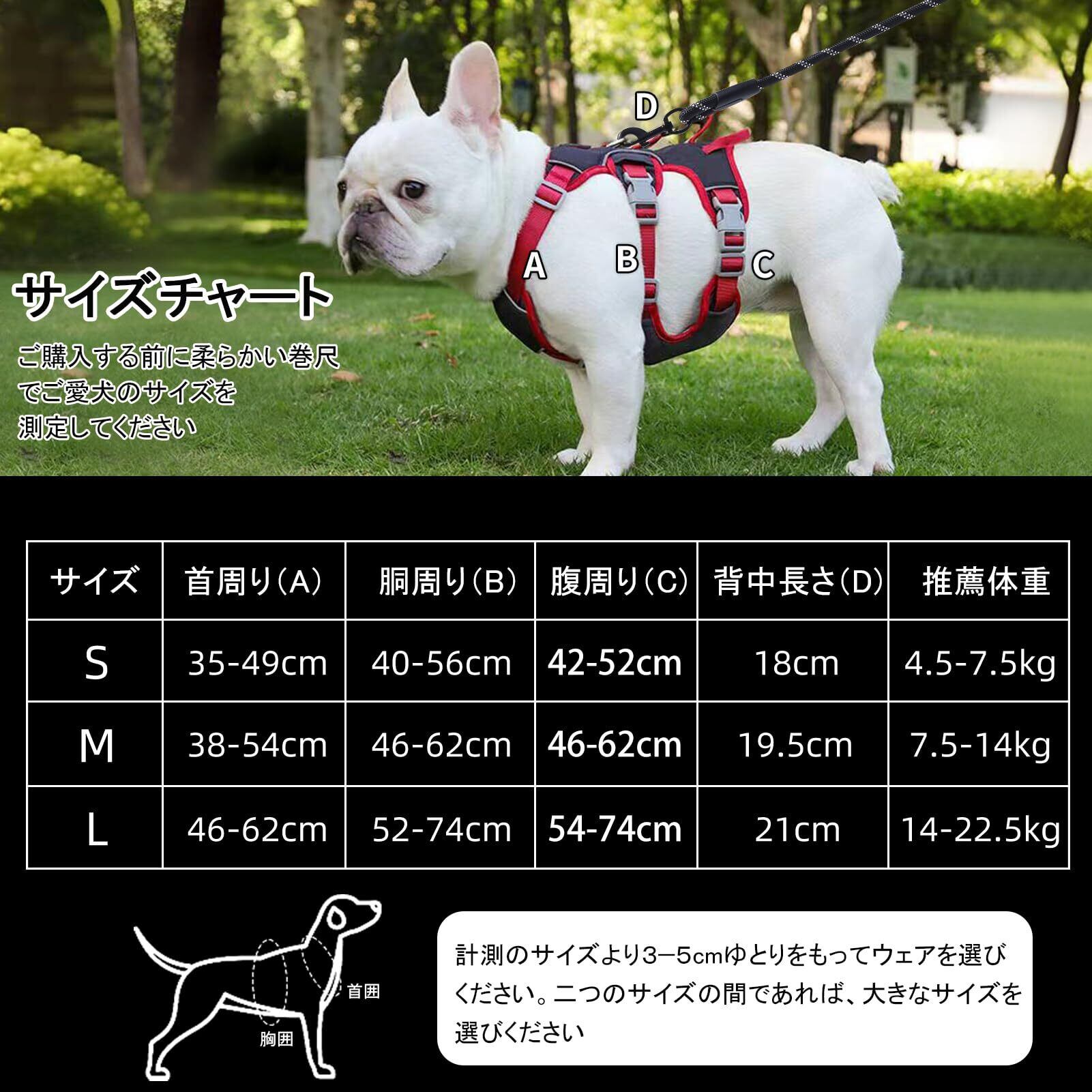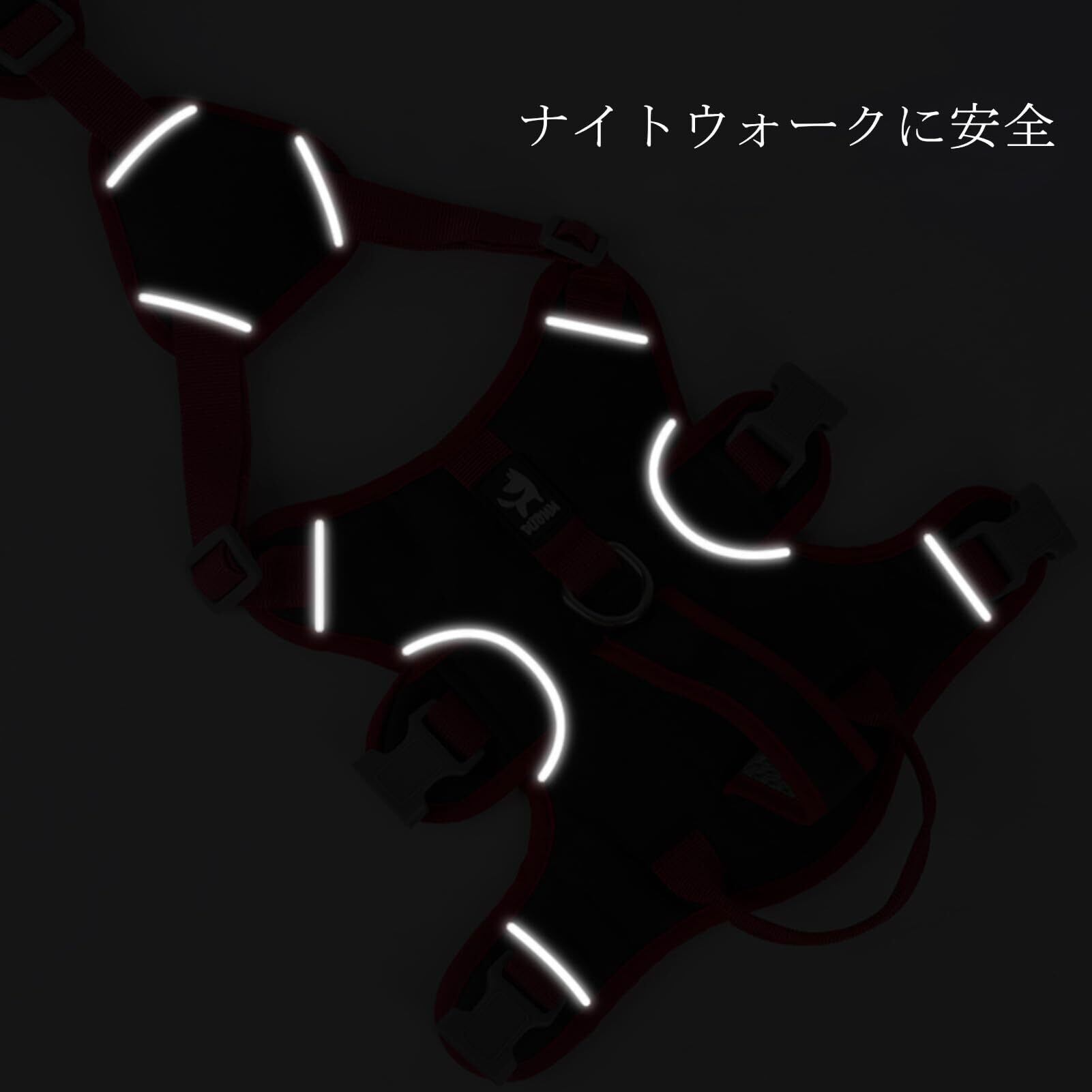 【幅広いサイズと多数の犬に適用】:犬ハーネスはS/M/L三サイズ展開で中型犬、大型犬、小型犬に適用します。ポメラニアン、チャウチャウ、チワワ、柴犬、秋田犬、フレンチブルドッグ、ミニチュア ダックスフント、ベルジアン マリノア コーギーなどに最適の犬ハーネスです。ハーネスは夜間反射素材で、ナイトウォークに安全です。夜間に犬の散歩とランニングなどでも車に見られないことを心配する必要はありません。