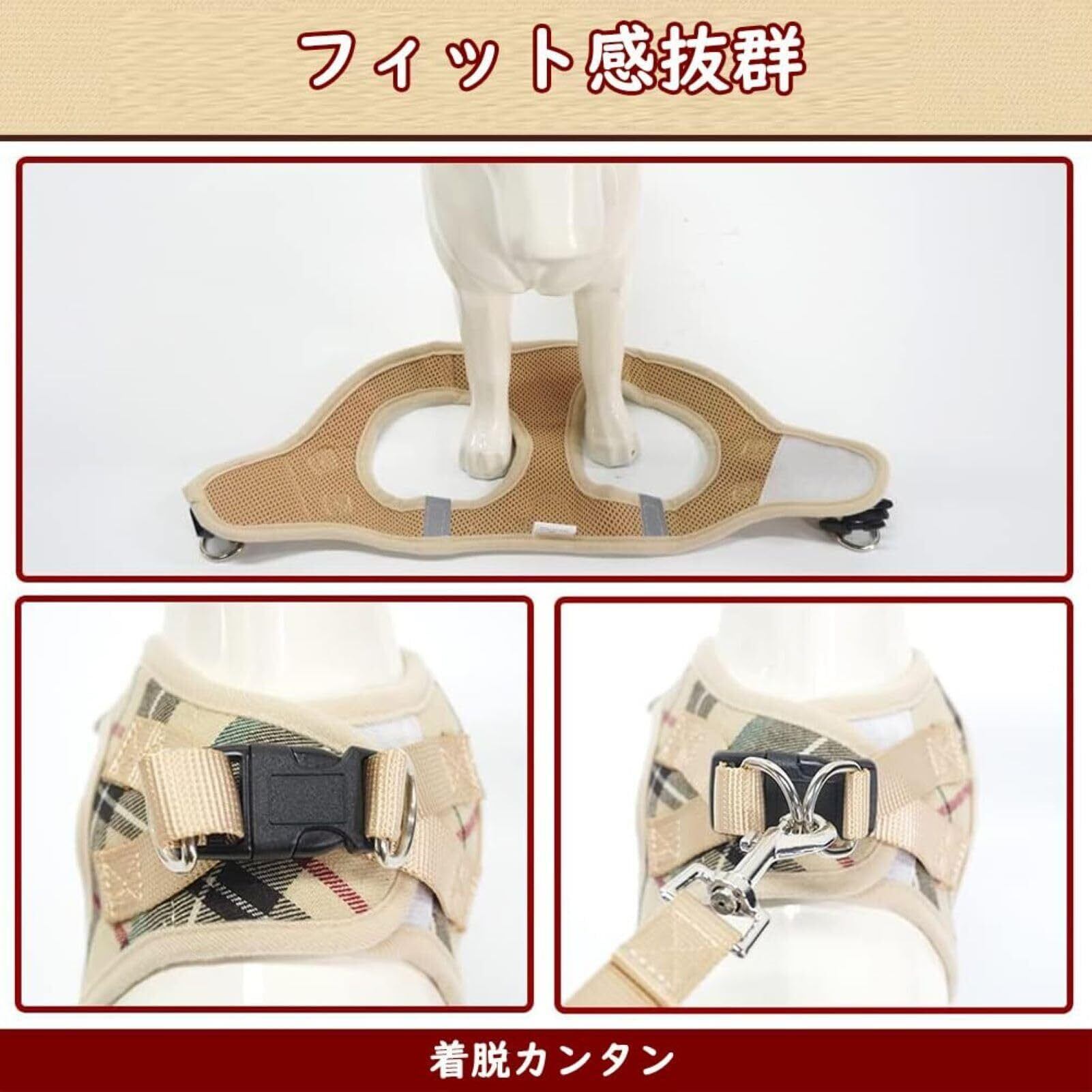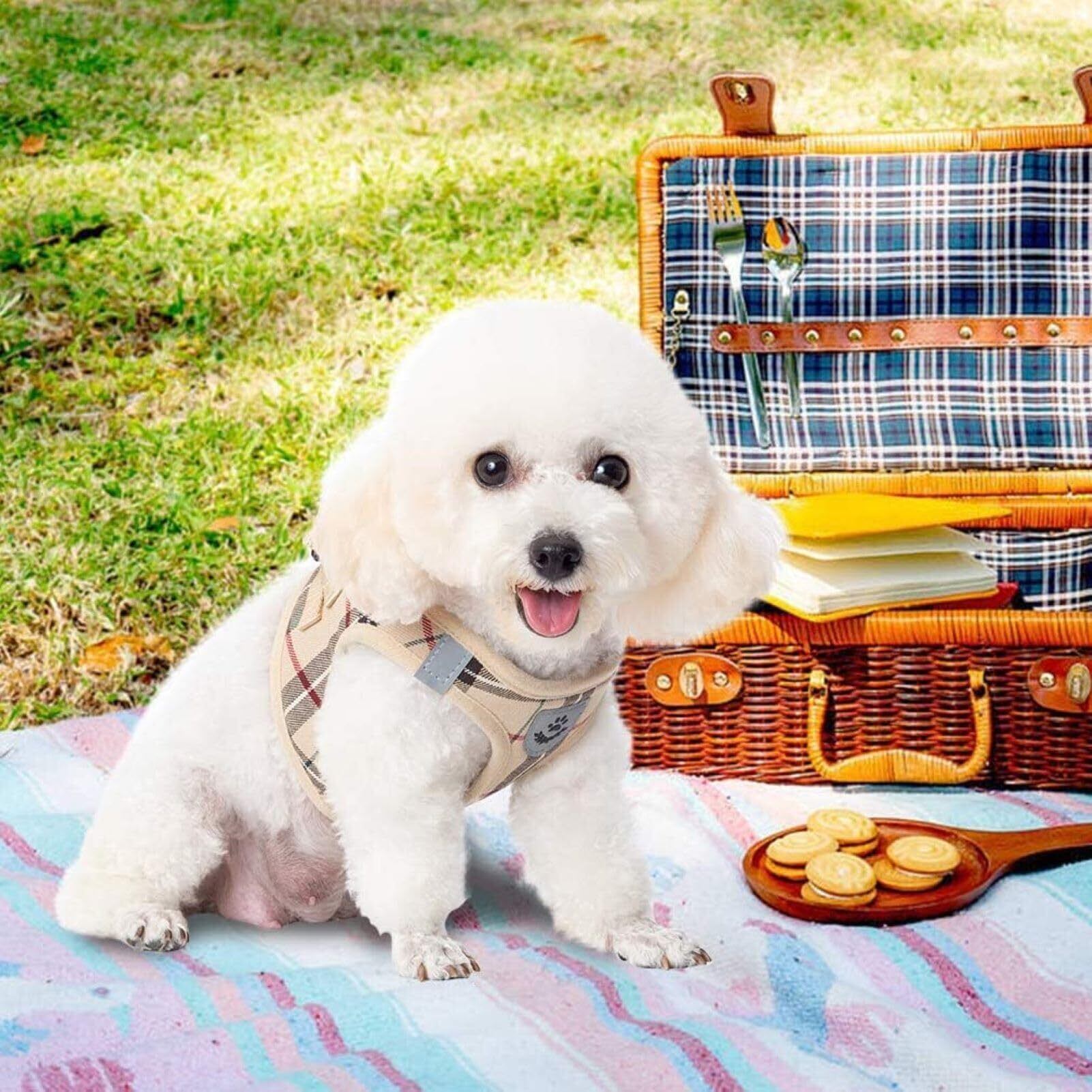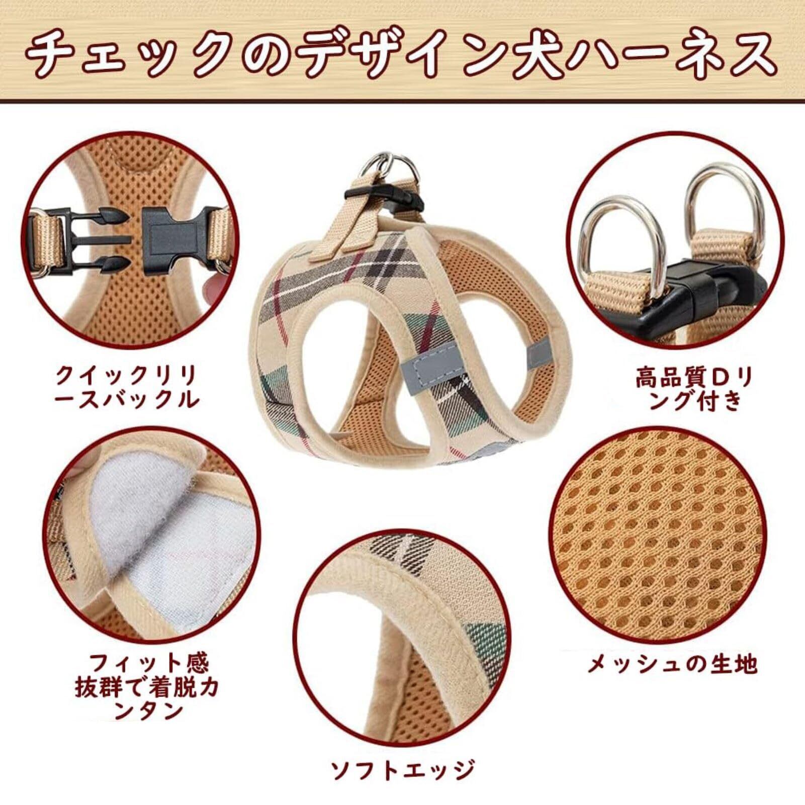 BINGPET 犬 ハーネス 首輪 リードセット 胴輪 小型犬 犬用ハーネス チェックデザイン ハンドル付き メッシュ素材 身体に優しい ベスト 反射材付き 調節可能 お散歩 着脱簡単 引っ張り防止 人気 おしゃれ 可愛い (ベージュ, XS)