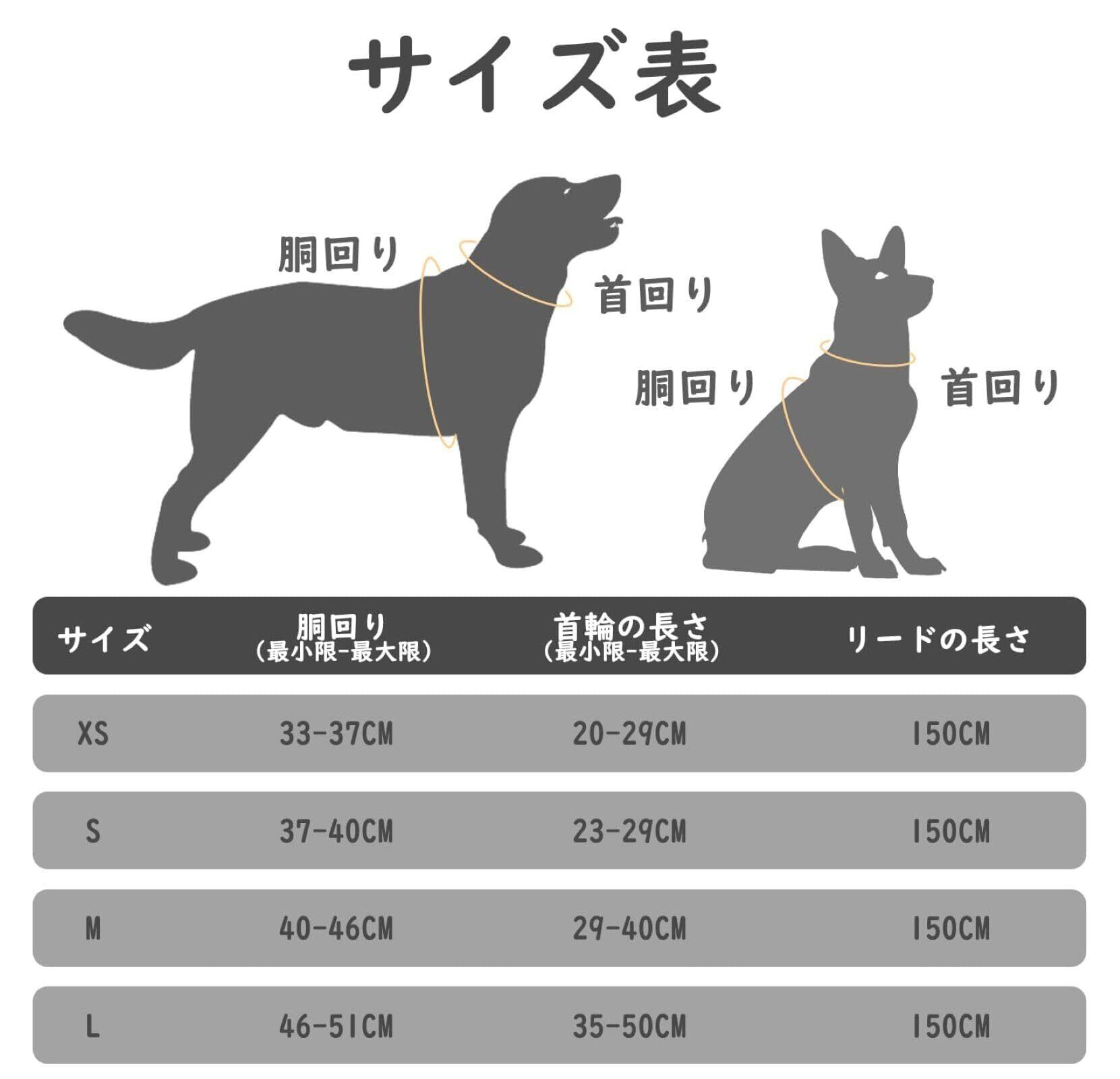 【セット仕様】ハーネス*1、首輪*1、リッド*1。 調節可能デザインのため、愛犬により快適にご使用いただけるよう、少し小さめのサイズをお選びいただくことをおすすめします。XSサイズ:首輪:20-29cm 胸囲:33-37cm /附属リード:150cm。 Sサイズ:首輪:23-29cm 胸囲: 37-40cm/附属リード:150cm。 Mサイズ:首輪:29-40cm 胸囲:40-46cm/附属リード:150cm。 Lサイズ:首輪: 35-50cm 胸囲:46-51cm/附属リード:150cm。
