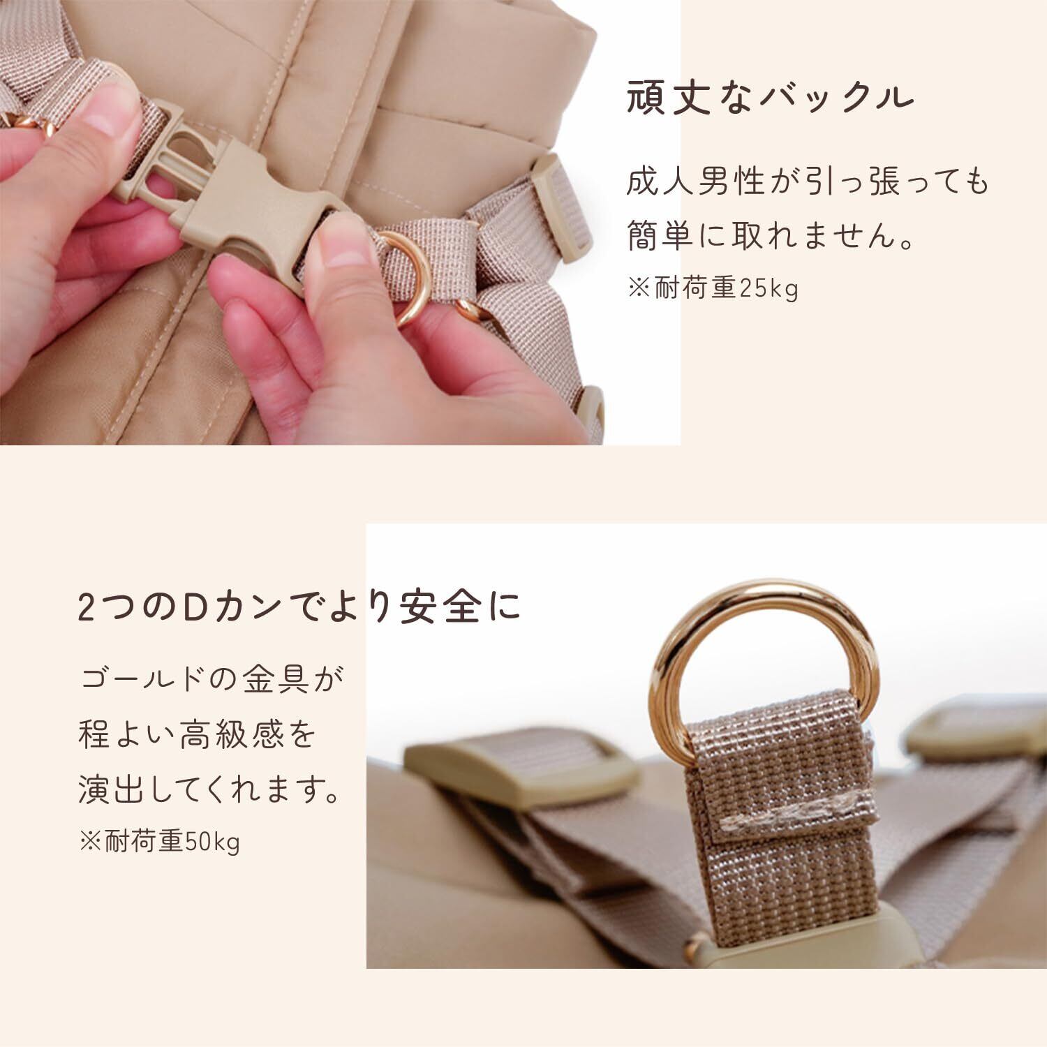 【安全を追求した高機能ディテール】成人男性が引っ張っても簡単には外れない頑丈なバックルを採用。さらに、リードを繋ぐ2つのDカン(ゴールド金具)を装備し、より安全性を高めました。見た目の高級感と実用性を両立しています。
