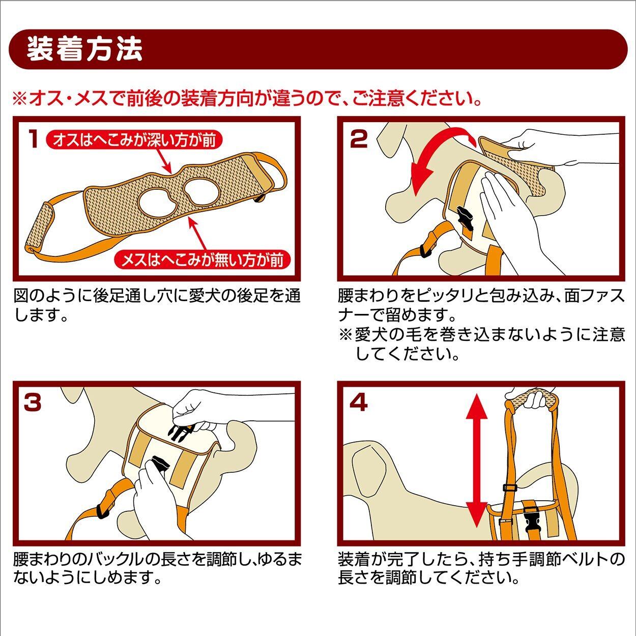 <装着方法>※オス、メスで前後の装着方向が違うので、ご注意ください。1、(オスはへこみが深い方が前、メスはへこみが無い方が前)後足通し穴にワンちゃんの後足を通します。2、腰まわりをピッタリと包み込み、面ファスナーで留めます。※ワンちゃんの毛を巻き込まないように注意してください。3、腰まわりバックルの長さを調節し、ゆるまないようにしめます。4、装着が完了したら、持ち手調節ベルトの長さを調節してください。<正しい使い方>check1、ワンちゃんの背中の位置から真上に引き上げてください。Check2、ワンちゃんの横に立った状態で、地面とワンちゃんの背骨のラインとが必ず平行になる高さを保つように持ち手調節ベルトを調節してください。check3、ケガ防止のため、引きずらないように注意してください。※ワンちゃんの歩行速度に合わせて進み、無理に引き過ぎないように注意してください。