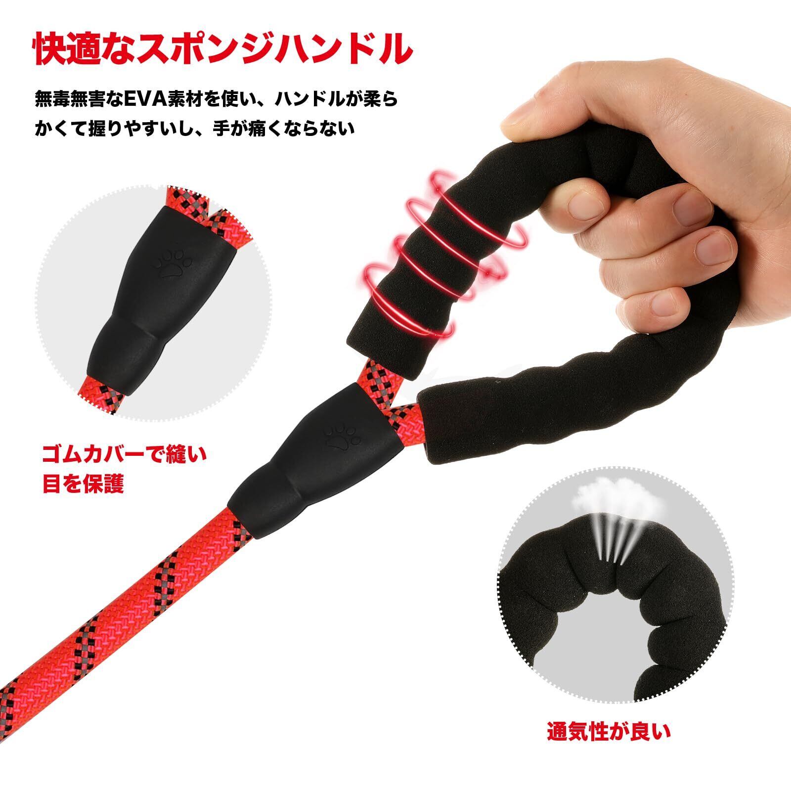 【快適なスポンジハンドル】人間工学に基づいて設計されたハンドルは、無毒無害なEVAスポンジからなり、手触りが良くて、適当な摩擦を提供します。飼い主さんはしっかりと犬 リード 中型犬をグリップすることができます。その上、長時間におけて握っても手に擦り傷が付きにくくて、強く引っ張られても手が痛くならず、愛犬との散歩を思う存分に楽しめます。