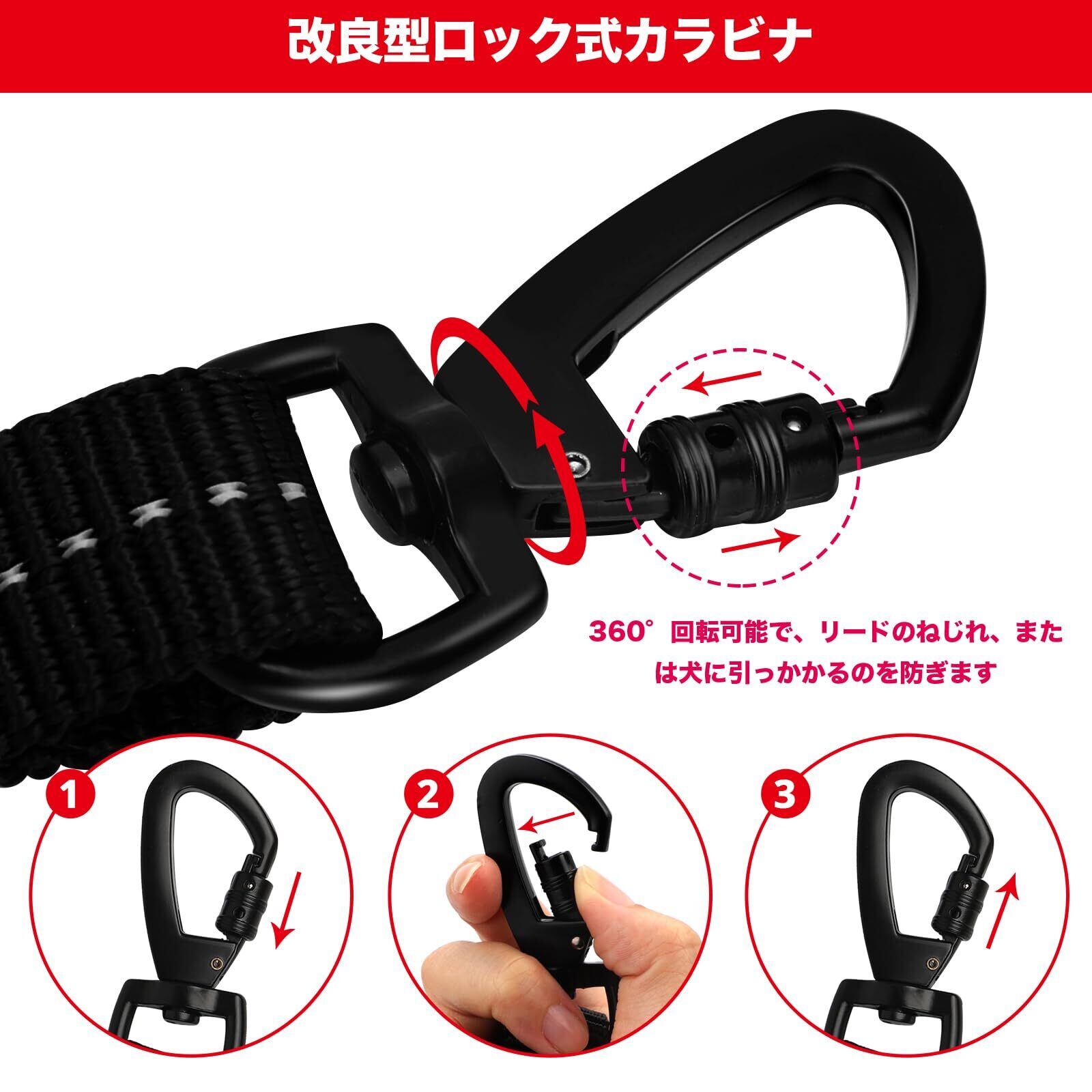 【最新ロック機能カラビナ】本犬のリードは、亜鉛合金製のロック式カラビナを用いて、一旦ロックされた上に、勝手に外れずにしっかり機能を果て尽くします。また、カラビナの底は360°回転可能の設計により、犬用リードのねじれ、または犬に引っかかるのを防ぎ、愛犬をいつでも自由に動き回せることができます。負担軽減にもお役に立てます。それに、サビに強いだけでなく、耐久性、着脱の利便性に優れていて、お頼りになれる犬 リード 小型犬です。